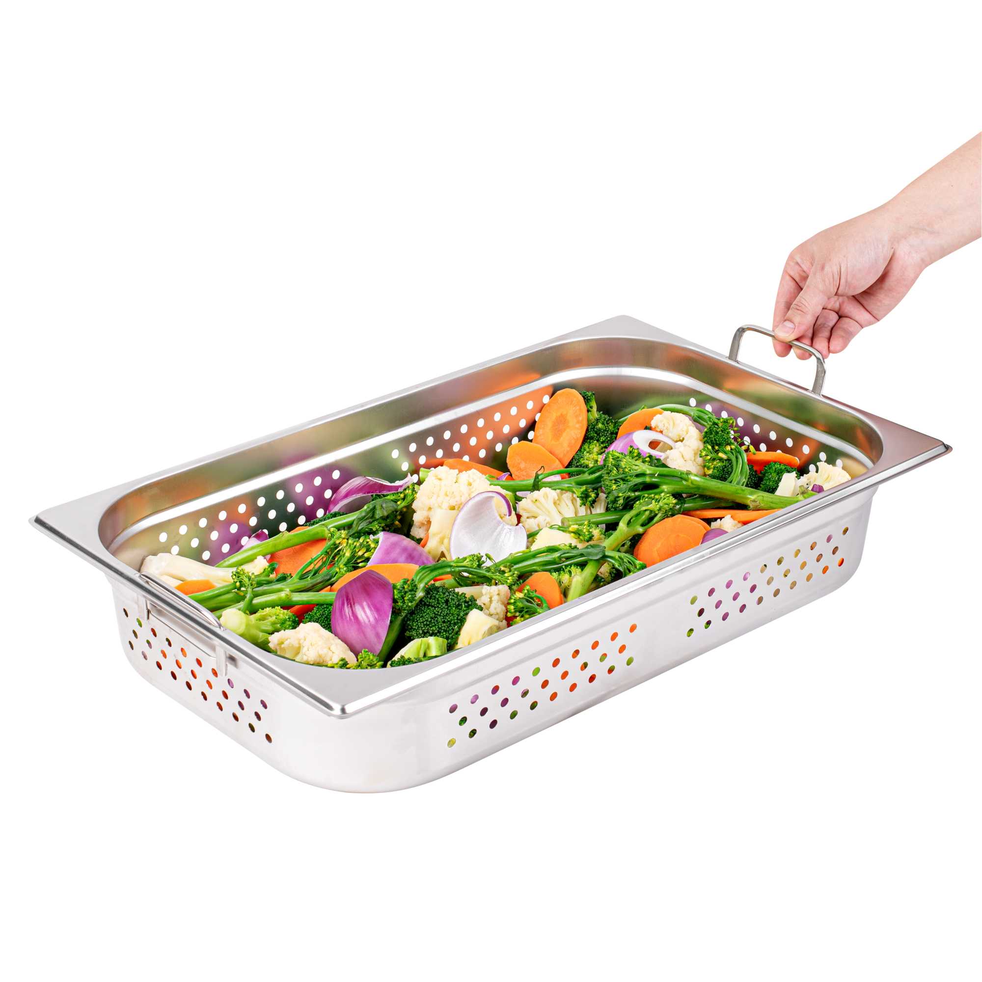 Instantly improve your buffet service and catered events with our Met Lux Full Size Anti-Jam Perforated Stainless Steel Steam Table Pans with Collapsible Handles. Equipped with built-in handles, these perforated steam table pans make steaming and draining your prepared foods a breeze. Their reinforced corners are designed to resist warping and cracking, while their impact-resistant stainless steel construction ensures reliable and long-term commercial use. These full-size steam table pans also feature an anti-jamming design to enable easy stacking and hassle-free storage. These 4-inch deep restaurant steam table pans are great for storing and warming large portions of steamed vegetables, poached seafood, cooked pasta, and more! Pair these perforated hotel pans with our spill-resistant travel lids (SKU: RWT0051) or traditional stainless steel pan lids (SKU: RWT0045) to complete the look. Each order will contain one 20.8-inch L x 12.8-inch W x 4-inch H steam table pan with handles.
