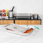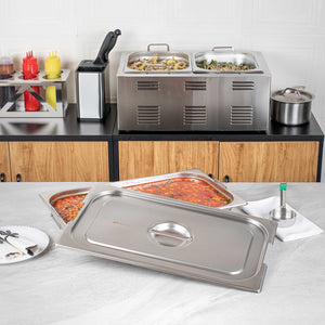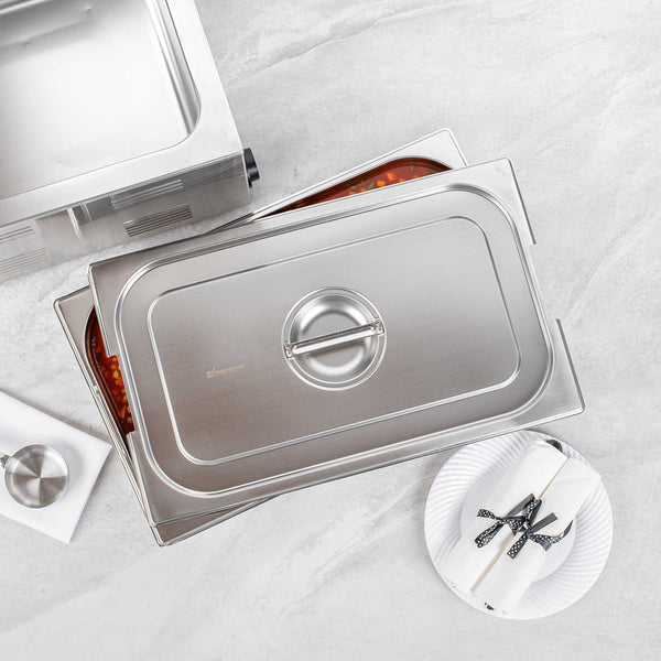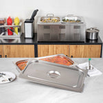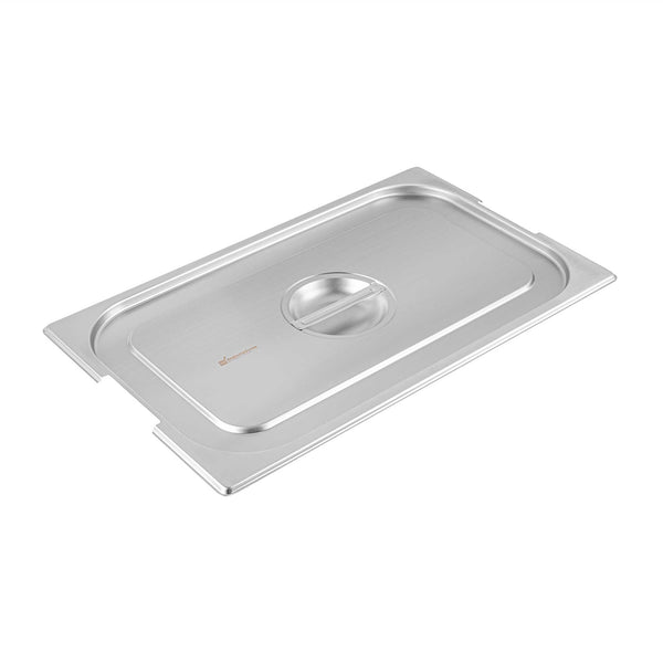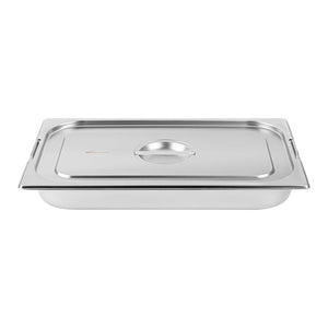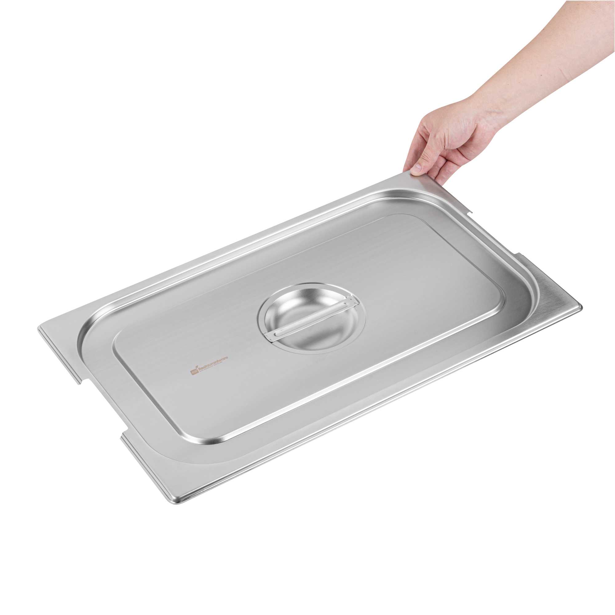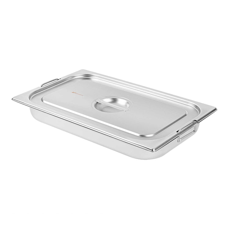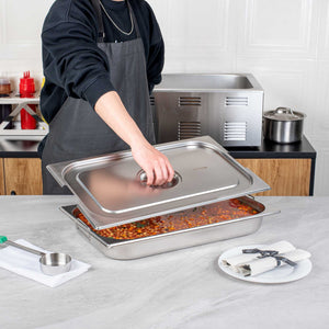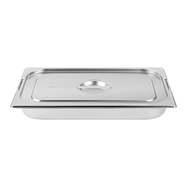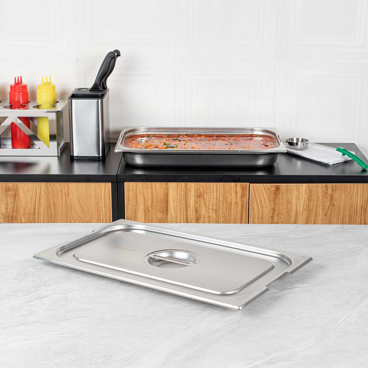 Find the best fit for your Met Lux Full Size Steam Table Pans with this high-quality steam table pan lid! Designed from impact-resistant stainless steel, this hotel pan lid rests snugly on our coordinating pans to lock in heat and keep your foods enjoyably warm. Its reinforced edges expertly contain heat, while its large and easy-to-grip handle provides safe and easy access inside. Featuring a classic stainless steel finish, these full size steam table pan lids are the perfect finishing touch for hotel buffet services, corporate luncheons, and other catered events. Pair this 20.8-inch L x 12.8-inch W lid with any of our Met Lux Full Size Steam Table Pans (such as SKU: RWT0026) to complete the look. Shipped in a 1 count box.