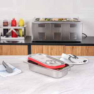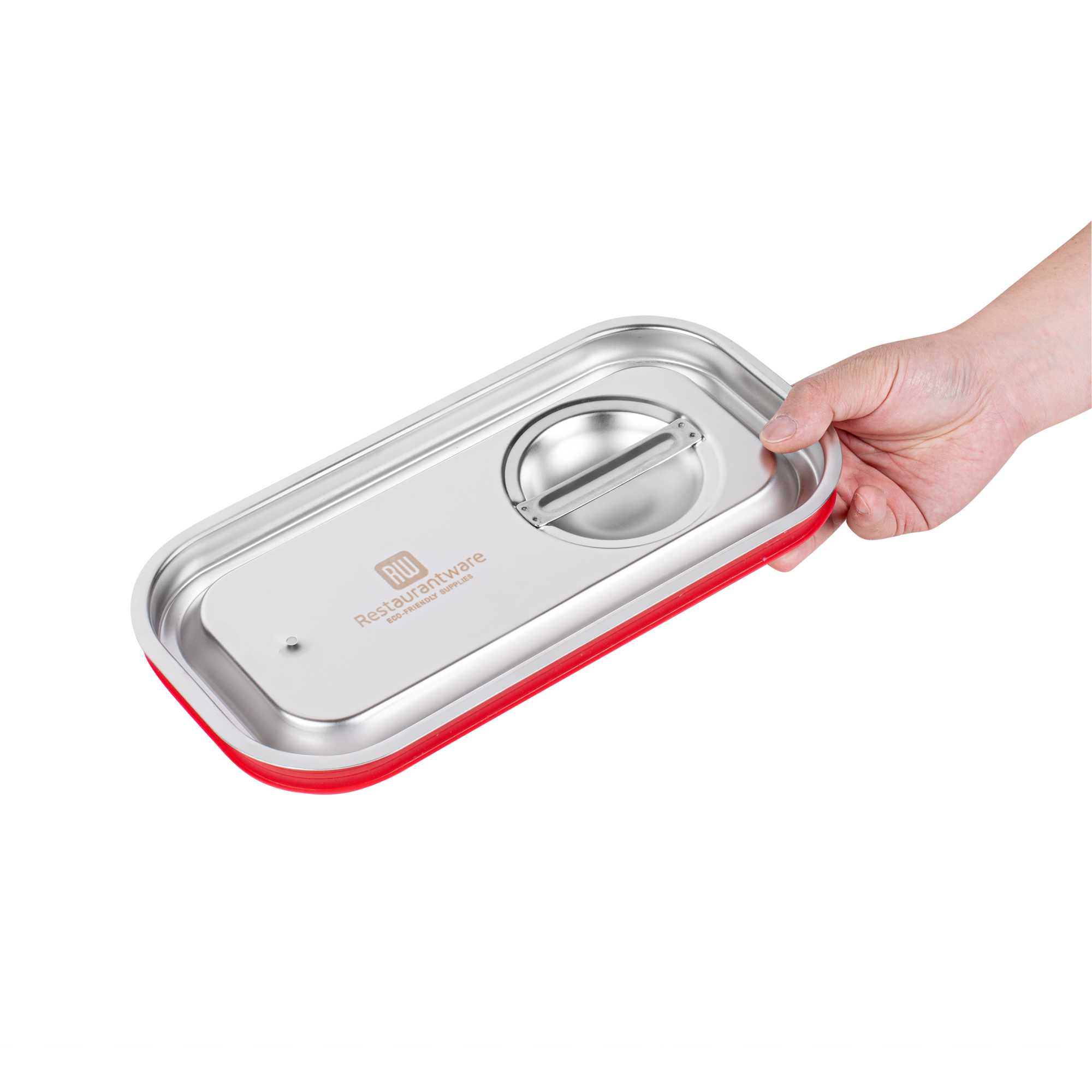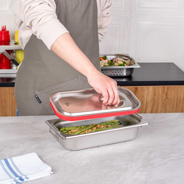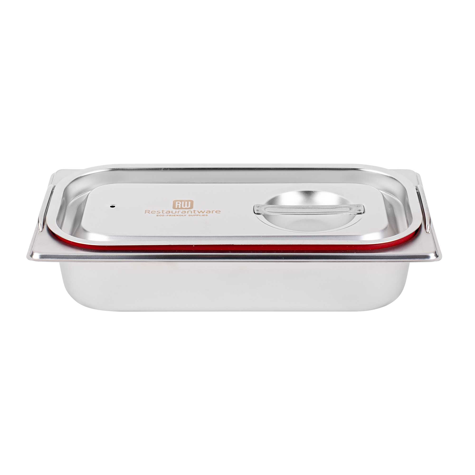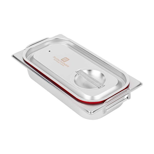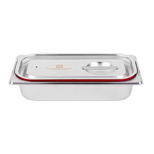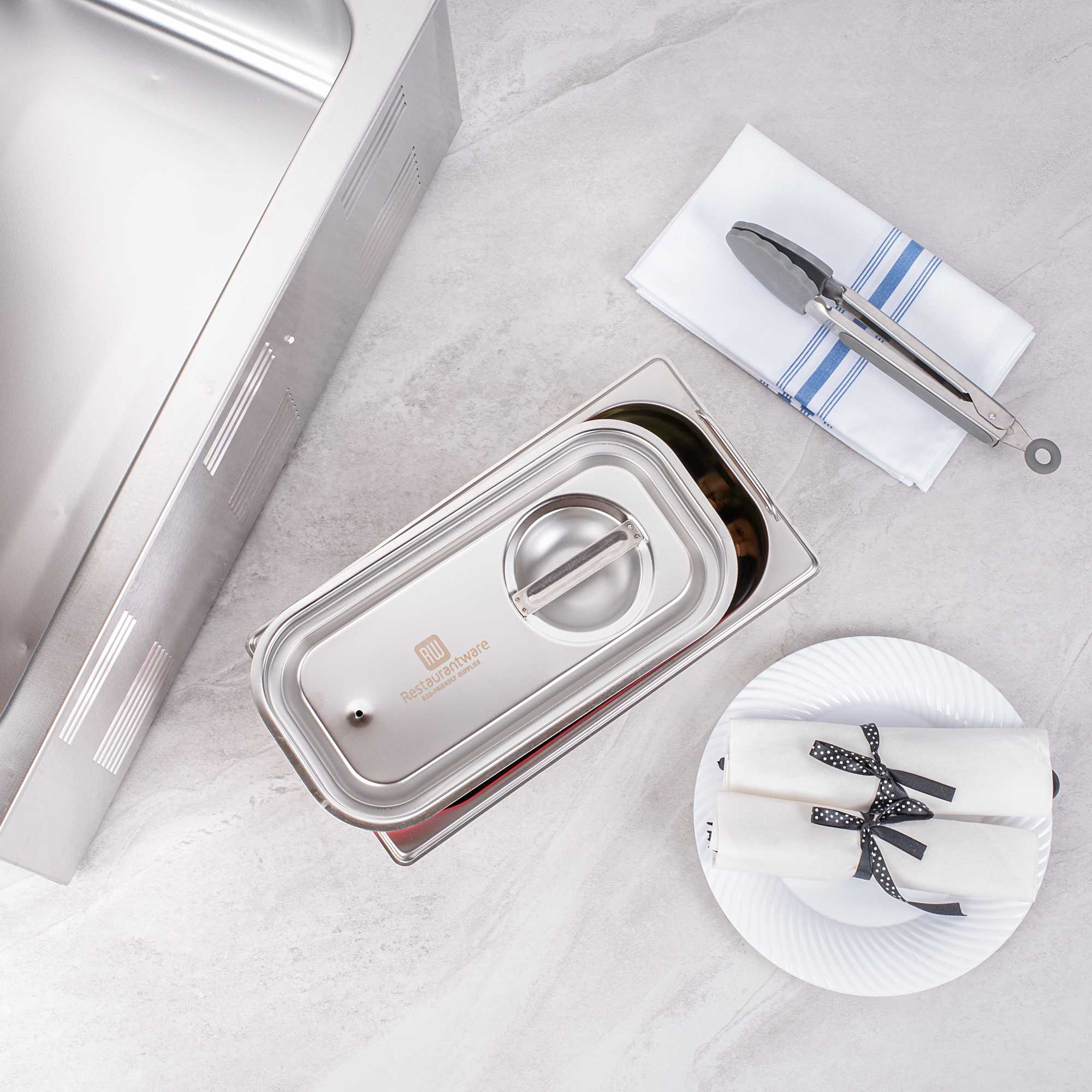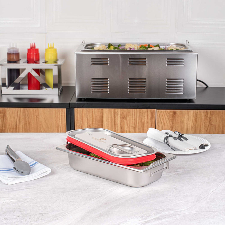 Make catering off-site events a breeze with our innovative Met Lux 1/3 Size Steam Table Pan Travel Lid. Equipped with a built-in silicone seal, this steam table lid fits tightly on our coordinating steam table trays to diminish the risk of spills and messes on the go. Its impact-resistant stainless steel construction ensures reliable and long-term use for commercial catering and restaurant steam tables. Designed with reinforced edges to expertly lock in heat, this hotel pan lid is also designed with a large, easy-to-grip handle for safe and easy access inside. Pair these 12.8-inch L x 7-inch W steam table travel lids with our selection of Met Lux 1/3 Size Steam Table Pans (such as SKU: RWT0037) for portable service at banquets, corporate functions, and other catered events. Shipped in a 1 count box.