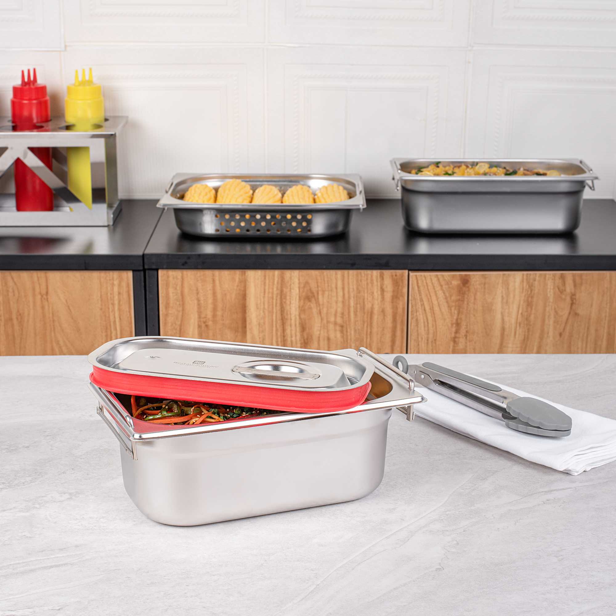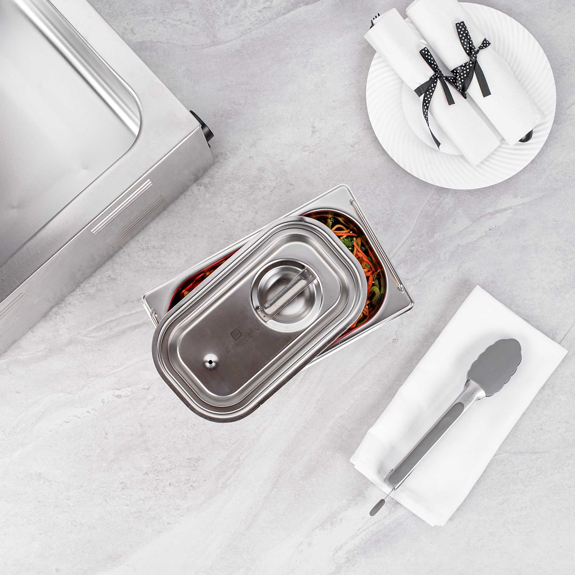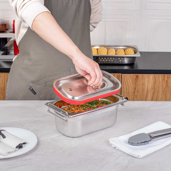 Effortlessly transport your prepared dishes to off-site catering events with our Met Lux 1/4 Size Steam Table Pan Travel Lid. Designed with a built-in silicone seal, this steam pan lid forms a tight-fitting seal on our restaurant steam table pans to lock in heat and prevent messes. Pair our steam pans with lids to easily transport trays of your food to corporate functions, weddings, and other catered functions. This steam table travel lid features an easy-to-grip handle and impact-resistant stainless steel construction to keep your food safe and secure on the go. Browse our selection of Met Lux 1/4 Size Steam Table Pans (such as SKU: RWT0039) to complete your serving solution. Sold in a 1 count box.