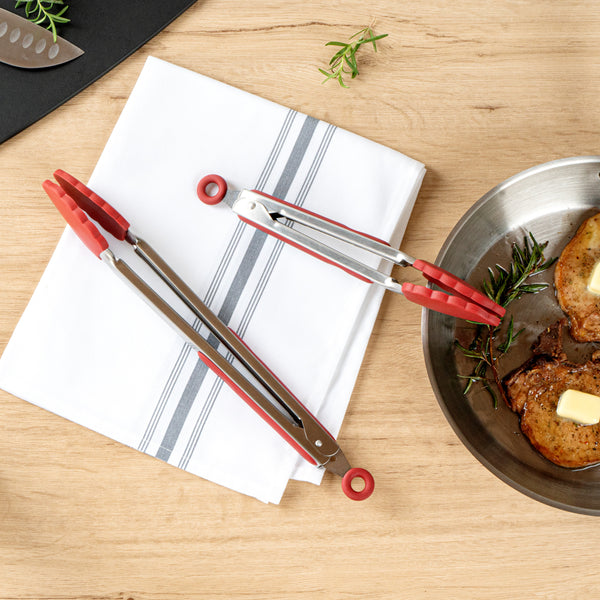 These professional chef tongs are available in two sizes and an array of appealing colors to match individual kitchen aesthetics. Also available as a set of two.