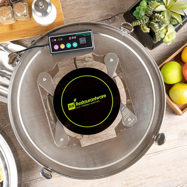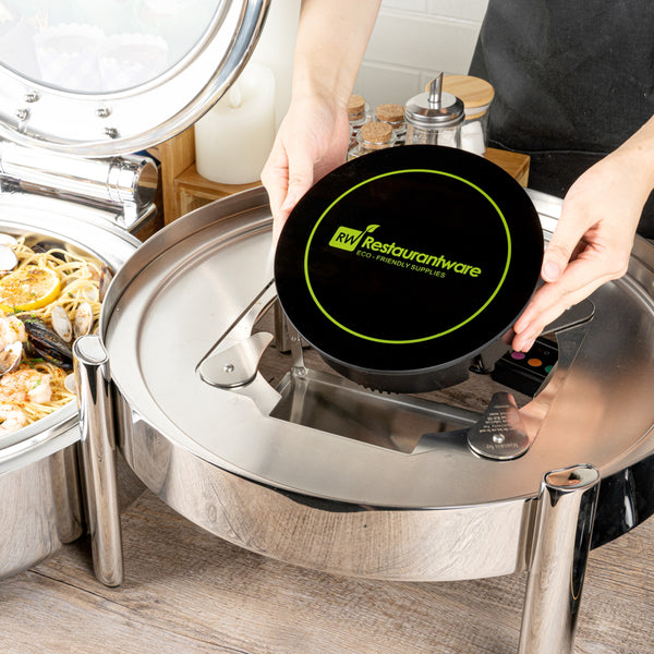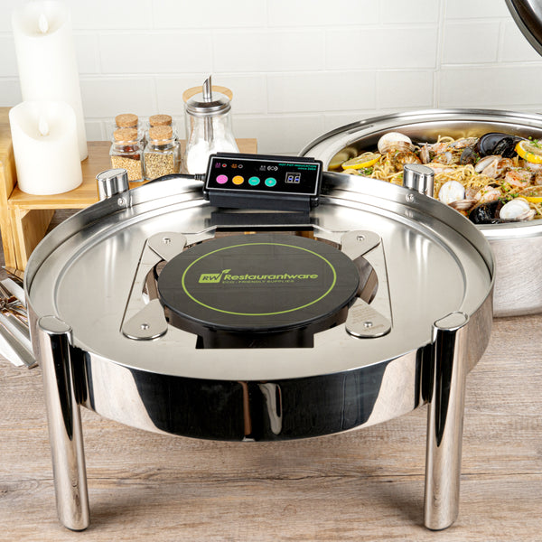 Keep your prepared meals hot and ready to serve with our Met Lux Round Black Induction Warming Unit. Sold with an easy-to-use remote, this chafing dish warmer provides an efficient way to keep your food warm with its adjustable temperature and timer settings. This 500-watt chafer warmer has a compact design that is lightweight to easily carry to events while providing space-saving storage in your kitchen. Built with a crystal plate, this induction warmer is inherently crack-resistant and has a smooth surface to easily wipe down at the end of the day. Pair this warming unit with our collection of compatible chafers to keep meals warm at a buffet or catered event. Measuring 9.5 inches long by 3 inches tall, this chafer warmer is available in a 1 count box.