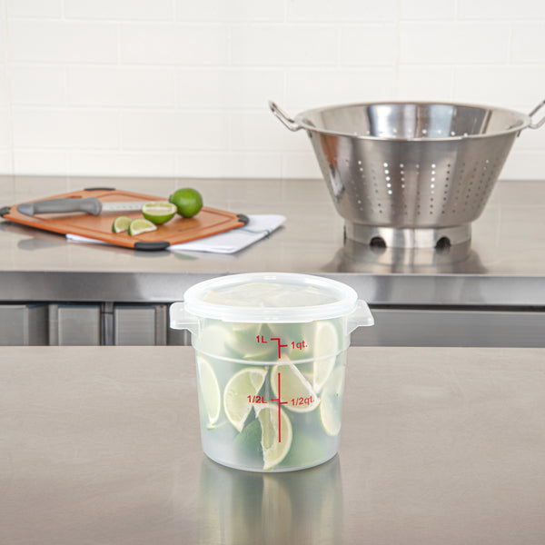 Ensure easy, efficient meal prep with this leak-resistant lid. The Met Lux Leak-Resistant Food Storage Lid provides a secure fit for 1-quart round containers, thanks to its translucent plastic construction that streamlines kitchen operations by allowing quick content identification. This plastic container lid features a BPA-free composition, safeguarding stored ingredients from contamination and maintaining food safety standards. Its durable design withstands the demands of busy kitchens, reducing replacement costs while its freezer-safe capabilities keep soups and stews fresh for longer periods. Designed with a pull-corner tab, this food storage lid enhances service efficiency in fast-paced environments, and its dishwasher-safe feature ensures quick cleanup. Elevate your storage solutions with this essential kitchen tool, perfect for maintaining the freshness of prepared dishes. Each order includes 1 Met Lux Leak-Resistant Food Storage Lid measuring 5.25 inches in diameter.