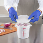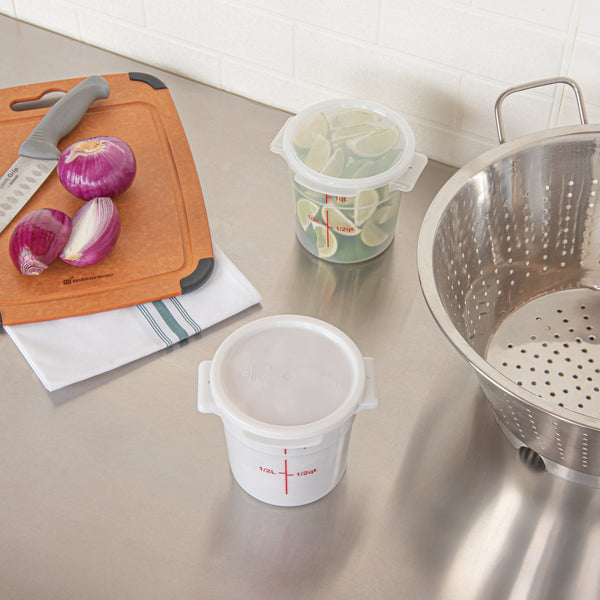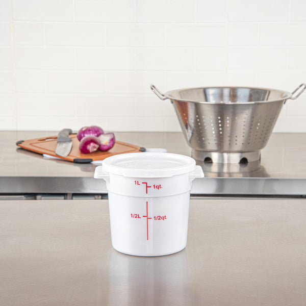 Simplify food prep and storage with this dependable white lid. The Met Lux Leak-Resistant Food Storage Lid is specially crafted to fit 1-quart round containers, delivering a snug seal that prevents messy spills during storage or transport. Its solid white plastic design offers a clean, professional look while keeping contents covered and secure. Built from BPA-free plastic, this storage lid protects food quality and ensures compliance with food safety standards. Strong enough to endure heavy kitchen use, it cuts down on replacement needs, while its freezer-safe feature makes it ideal for preserving soups, sauces, and prepped ingredients. Designed with a convenient pull-tab corner, it allows quick lid removal to speed up service in high-volume kitchens. For added convenience, its dishwasher-safe construction streamlines cleanup at the end of the day. Upgrade your storage system with this durable and practical lid solution. Each order includes 1 Met Lux Leak-Resistant Food Storage Lid measuring 5.25 inches in diameter.