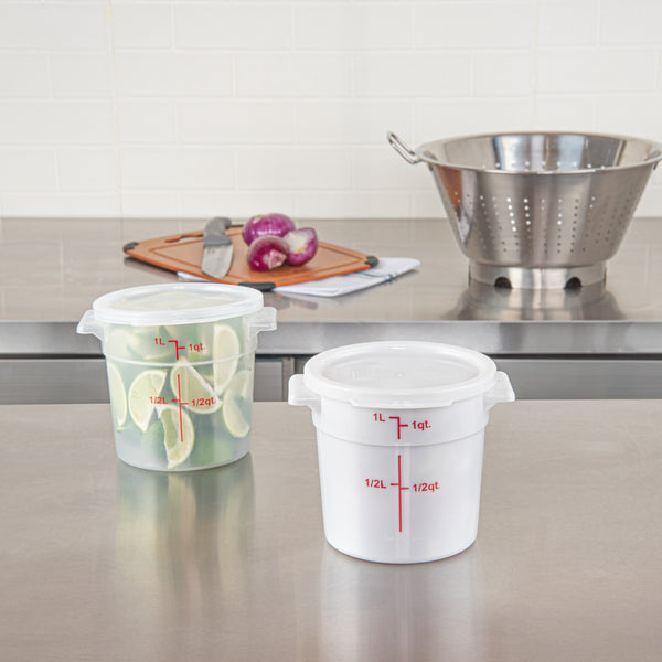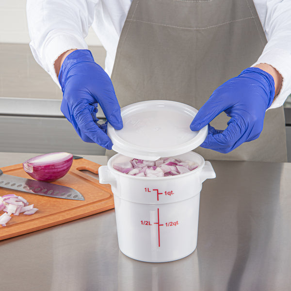 Simplify food prep and storage with this dependable white lid. The Met Lux Leak-Resistant Food Storage Lid is specially crafted to fit 1-quart round containers, delivering a snug seal that prevents messy spills during storage or transport. Its solid white plastic design offers a clean, professional look while keeping contents covered and secure. Built from BPA-free plastic, this storage lid protects food quality and ensures compliance with food safety standards. Strong enough to endure heavy kitchen use, it cuts down on replacement needs, while its freezer-safe feature makes it ideal for preserving soups, sauces, and prepped ingredients. Designed with a convenient pull-tab corner, it allows quick lid removal to speed up service in high-volume kitchens. For added convenience, its dishwasher-safe construction streamlines cleanup at the end of the day. Upgrade your storage system with this durable and practical lid solution. Each order includes 10 Met Lux Leak-Resistant Food Storage Lids measuring 5.25 inches in diameter.