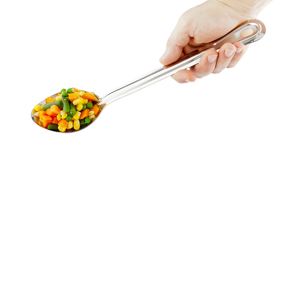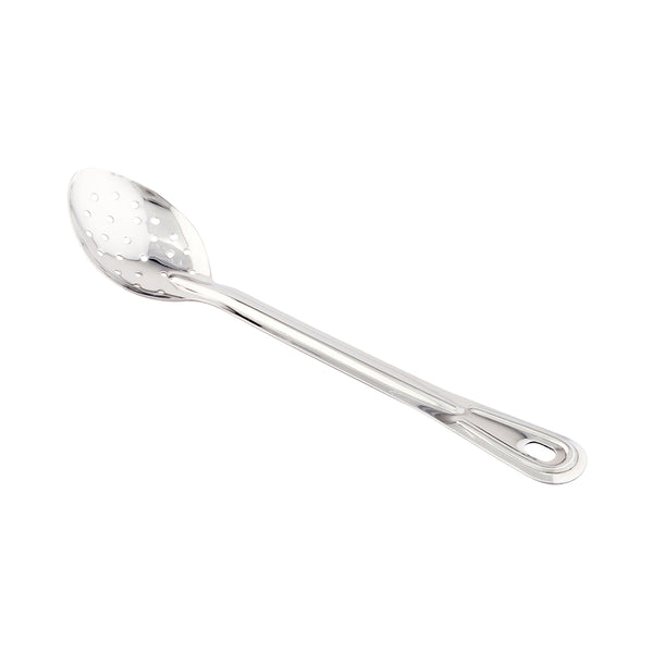 Plate your dishes efficiently with this Met Lux Professional Perforated Serving Spoon. Constructed from high-grade stainless steel, this slotted serving spoon is incredibly durable and heat-resistant. Its rounded, perforated all-purpose bowl is perfect for stirring delicate sauces in the kitchen or scooping up sauteed vegetables on a buffet. Built with a deeply grooved handle, this stainless steel serving spoon is easy to grip and comfortable to hold - promoting quick and efficient use. These serving spoons with holes are ideal for straining and serving messier foods to keep your customers' plates clean and mess-free. Each of these basting spoons measures 13 inches long and features a beautiful polished stainless steel finish. Shipped in a 1 count box.
