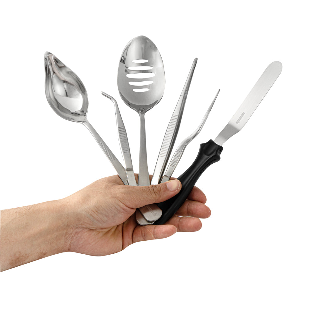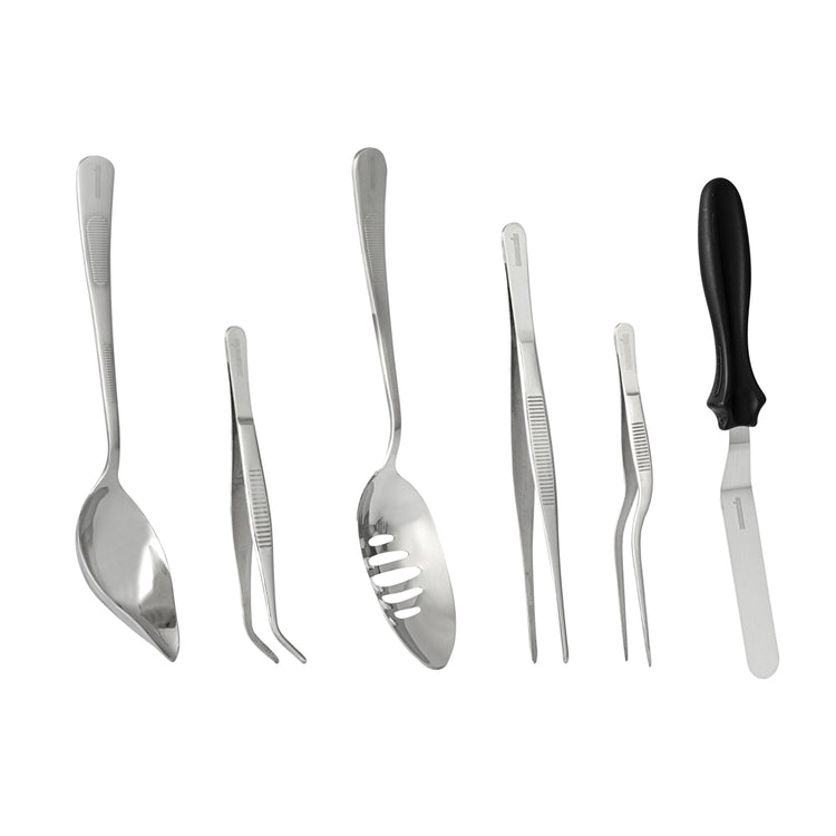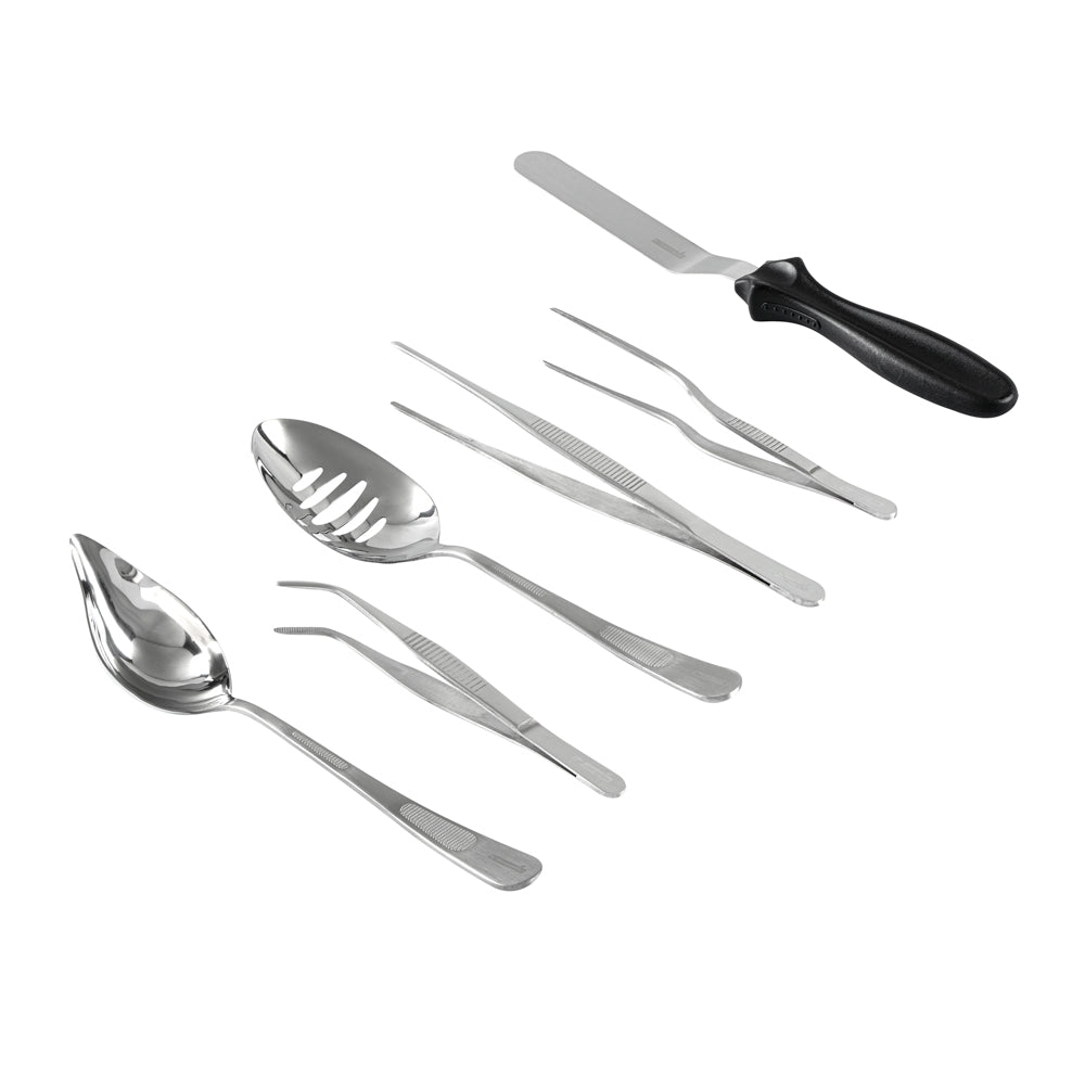 To fulfill your various needs, this plating tool kit includes a spatula, a straight tong, a curved tong, an offset tong, a saucier spoon, and a slotted plating spoon. Enhance your plating skills.