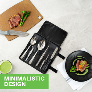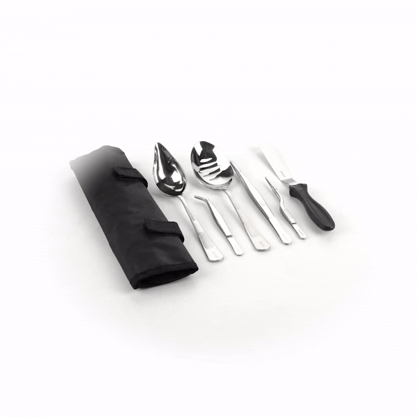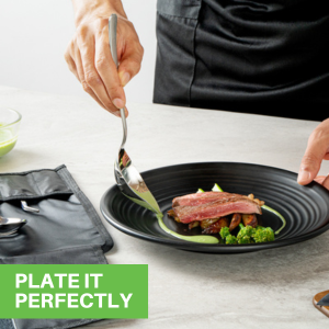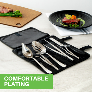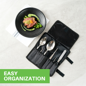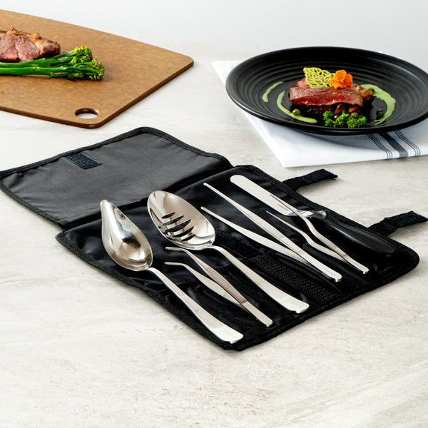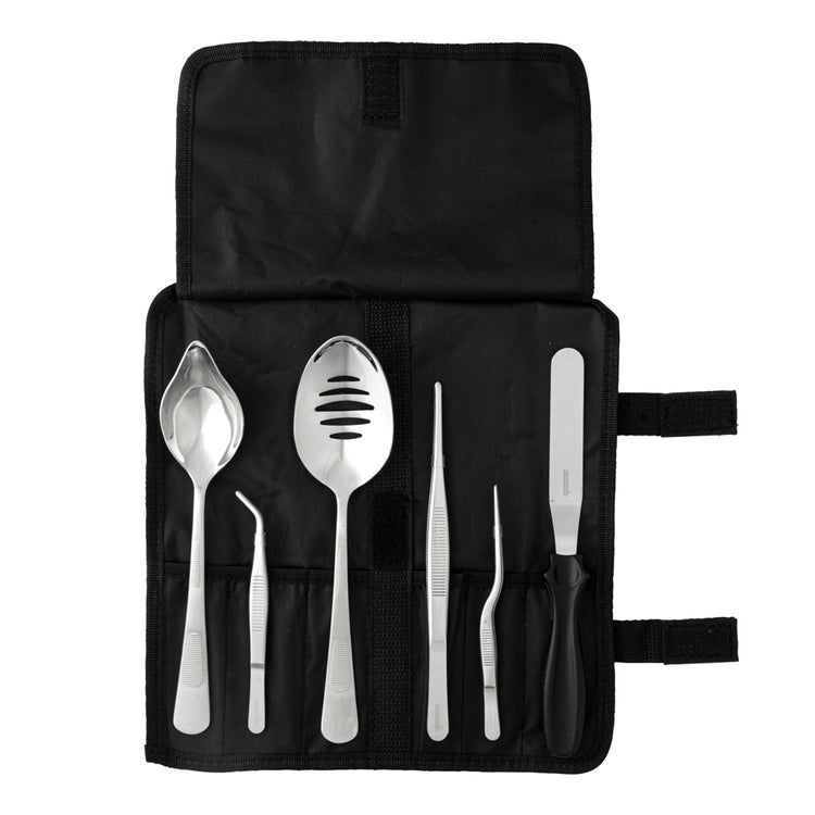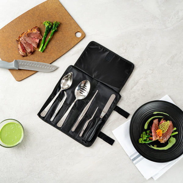 This chef plating tools set comes packed in a 6-compartment roll pouch to keep your plating tools organized and accessible. Ideal for professional chefs and culinary enthusiasts on the go.