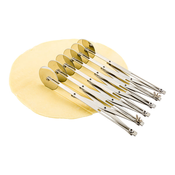 Create evenly-sized pastry strips with our Met Lux Stainless Steel 6-Wheel Pastry Cutter. The stainless steel construction of this 6-wheel pastry cutter prevents rust and is built to be long-lasting. This incredible multi-wheel pastry cutter has 6 wheels to cut through large sheets of dough. The sharp wheels cut precisely and accurately through your delicious pastries or homemade pasta. With an expandable and collapsible design, this stainless steel pastry cutter can easily create strips up to 5 inches wide to strips as thin as 0.5 inches wide. Plus, this accordion pastry cutter conveniently saves space in your kitchen. This multi-wheel dough cutter is ideal for chefs, caterers, and bakers. This pasta cutter measures 9.5 inches in length and the wheels are 2.25 inches in diameter. Order in a 1 count box.