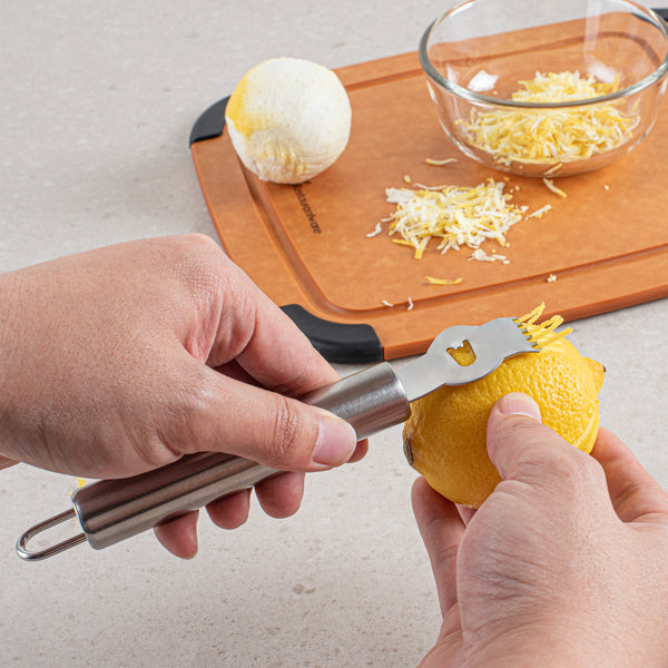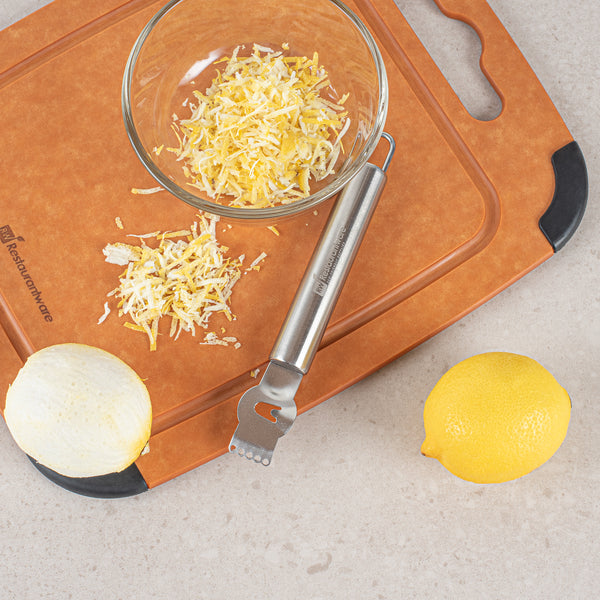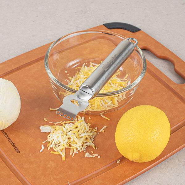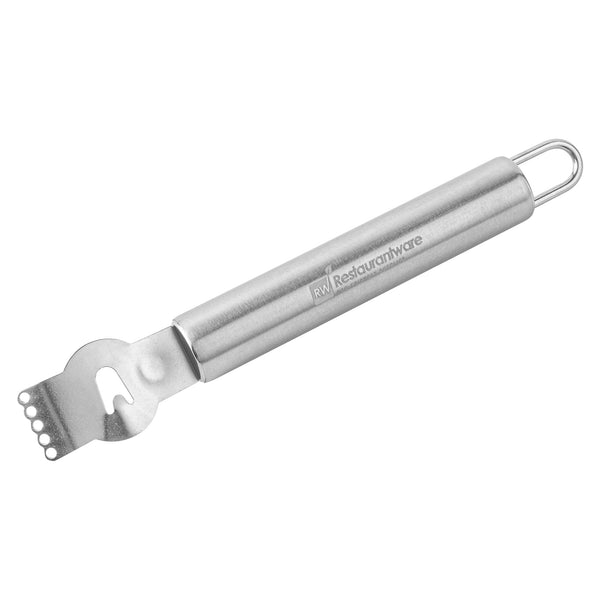 Easily add beautiful garnishes to cocktails or citrus flavors to desserts with our Met Lux Stainless Steel Citrus Zester and Channel Knife. With a 2-in-1 design, this versatile kitchen tool features a lemon zester and channel knife to easily complete multiple tasks with one tool. With 5 sharp holes, this citrus zester allows your kitchen staff to easily scrape the outer skin of oranges, lemons, limes, and other citrus fruits to instantly boost the flavor of baked goods. The channeling knife provides you with a simple way to create twisted garnishes for cocktails. Made from premium stainless steel, this corrosion-resistant lemon zester tool is built to seamlessly cut and zest citrus fruits and maintain its high-quality design for long-lasting use. Ideal for bars, bakeries, or restaurants, this stainless steel zester features an ergonomic handle to provide you with a comfortable grip and boost efficiency. This lime zester and channel knife has a hanging loop to conveniently store on hanging racks for space-efficient storage in your commercial kitchen. Measuring 6.5 inches long by 1-inch wide, this versatile channeling knife is shipped in a 1 count box.