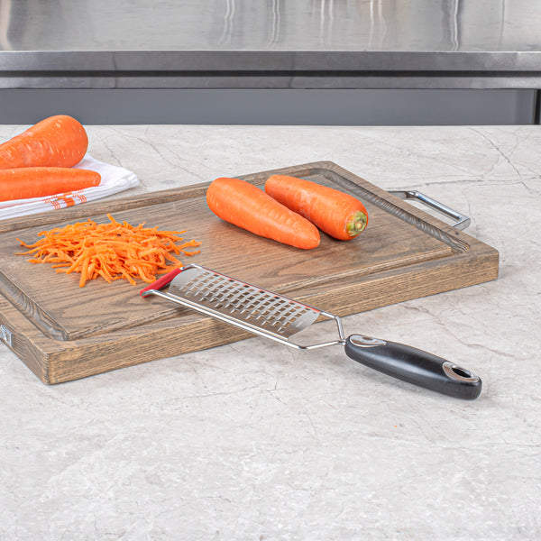 Add a burst of flavor to your recipes with coarsely grated cheeses, herbs, or aromatics from our Met Lux Coarse Grater. Featuring an easy-to-grip plastic handle, this hand grater is designed to fit nicely in your hand for comfortable and efficient use. This handheld cheese grater is equipped with a heavy-duty stainless steel blade with razor-sharp grating edges to effortlessly tackle any tough ingredients. Use this kitchen grater to grate cheddar cheese for macaroni and cheese, to shred zucchini for baking recipes, or to shave chocolate over cupcakes! Built to withstand long-term commercial use, this hand held flat cheese grater is perfect for restaurants, hotels, catering companies, food trucks, and any other foodservice establishments. Each hand grater measures 12 inches long and includes a plastic blade safety cover. Sold in a 1 count box.