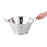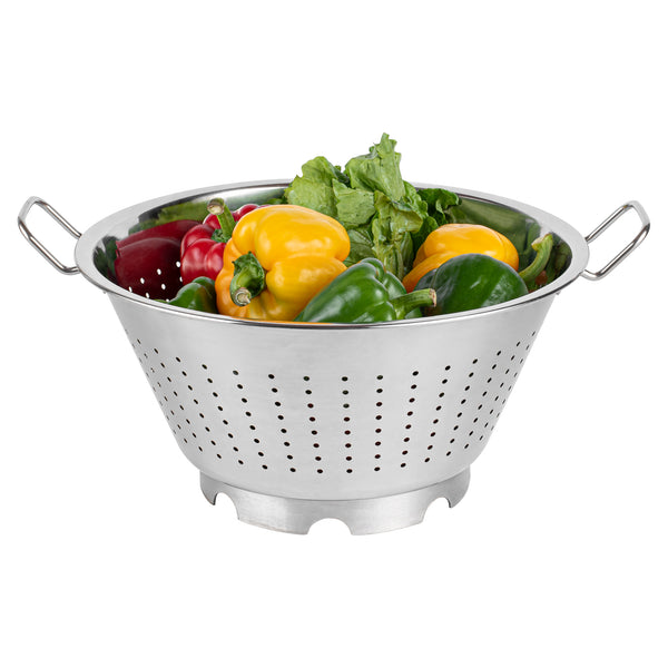 Easily accomplish all of your draining and straining needs with our Met Lux European Style Colander. Constructed from high-quality stainless steel, this large colander is built to be reliable and withstand long-term commercial use. Its raised base design provides a simple and mess-free way to rinse and drain your ingredients, while its dual handles make it effortless to lift foods out of the sink after straining. Measuring 14 inches wide, this stainless steel colander is ideal for use as a pasta strainer or to wash vegetables and fresh produce. This multi-purpose kitchen colander with handles is an essential tool for restaurants, catering companies, and other commercial kitchens. Shipped in a 1 count box.
