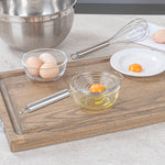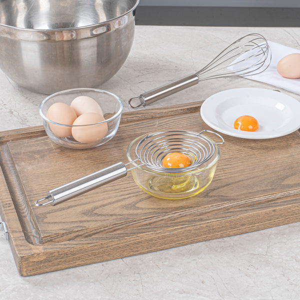 Seamlessly separate a dozen egg yolks from egg whites with our Met Lux Stainless Steel Egg Separator. With a spiral design, this egg sieve catches the yolk and allows the whites to fall through the spirals and into your bowl. The buckle of this yolk separator lays on to the rim of the bowl to ensure it doesn't slip and mix egg whites with the yolk. Designed with a handle, this egg yolk separator keeps hands free from touching ingredients while making your macarons or meringues. Equipped with a hanging hole at the end of the handle, this egg white filter provides easy storage at your bakery, restaurant, or coffee shop. Its silver finish effortlessly matches your existing commercial kitchen tools. Crafted from sturdy stainless steel, this egg divider is corrosion-resistant and dishwasher-safe to streamline your cleaning process. Measuring 10.25 inches long, this yolk remover is sold in a 1 count box.