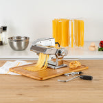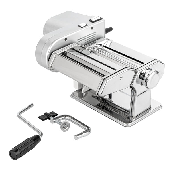 Effortlessly craft perfect pasta with consistent results. The Met Lux Electric Pasta Maker features an electric motor that ensures uniform pasta thickness, reducing the manual effort required to operate a traditional pasta machine. Designed with 9 adjustable thickness settings, this pasta roller with motor allows you to customize pasta thickness for diverse menus, catering to every customer’s preference. Its stainless steel construction offers durability and a sleek silver finish, making it a reliable and attractive addition to your kitchen. The two interchangeable blades provide seamless switching between spaghetti and fettuccine shapes, adding versatility to your pasta offerings. Measuring 14.6 inches in length, 9.4 inches in width, and 5.7 inches in height, this stainless steel pasta maker includes a stable, non-slip base for secure operation. Enhance your culinary efficiency with this highly adaptable kitchen tool. Each order includes 1 Met Lux Electric Pasta Maker.