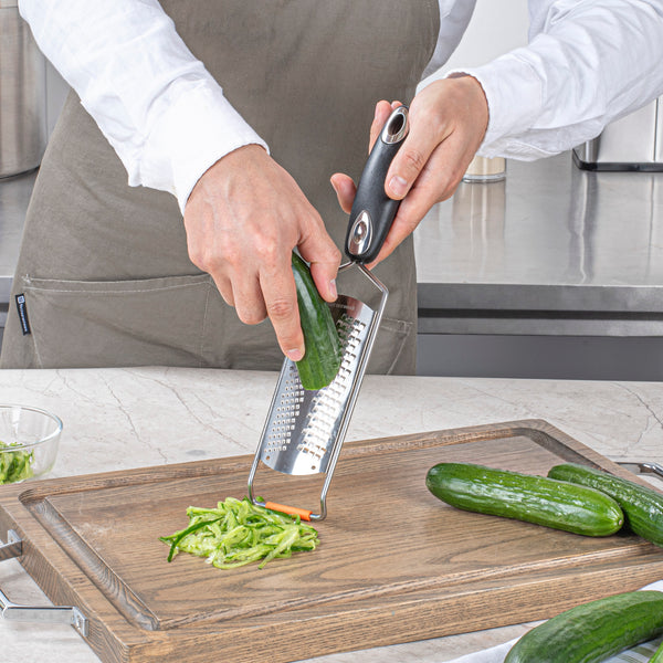 Add a pinch of finely grated cheeses or herbs to your favorite recipes with our Met Lux Fine Grater. Equipped with two built-in grating sizes, this hand held grater can be used to finely grate ingredients and also produce extra-fine ground ingredients. Use the coarser side for finely grating cheeses, zesting citrus, or shaving chocolate - and use the finer side for grinding spices, mincing garlic, or grating herbs. Featuring an easy-to-grip plastic handle, this fine grater is designed to fit comfortably in your hands for efficient use. This hand grater measures 12 inches long and includes a protective safety cover. Constructed with a heavy-duty stainless steel blade with razor-sharp edges, this fine grater is ideal for long-term commercial use in restaurants, hotels, catering companies, food trucks, and other foodservice establishments. Sold in a 1 count box.