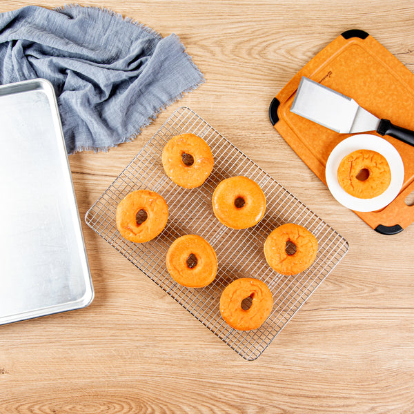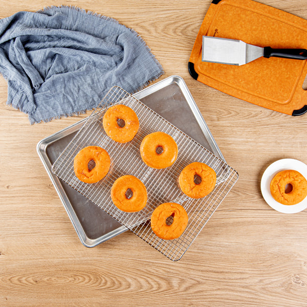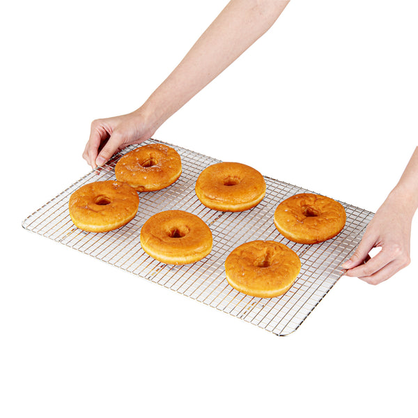 With perfectly spaced grid wires, these metal cooling racks ensure even air circulation for faster cooling after baking. The tight grids keep the baked goods in place without falling through.