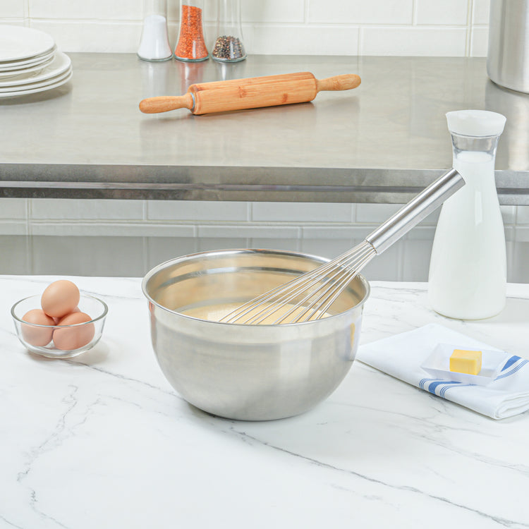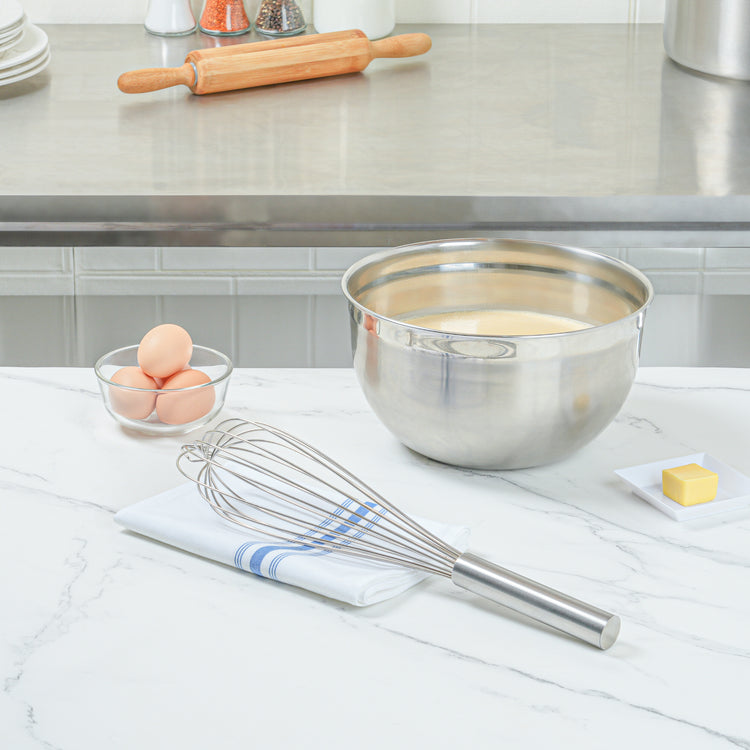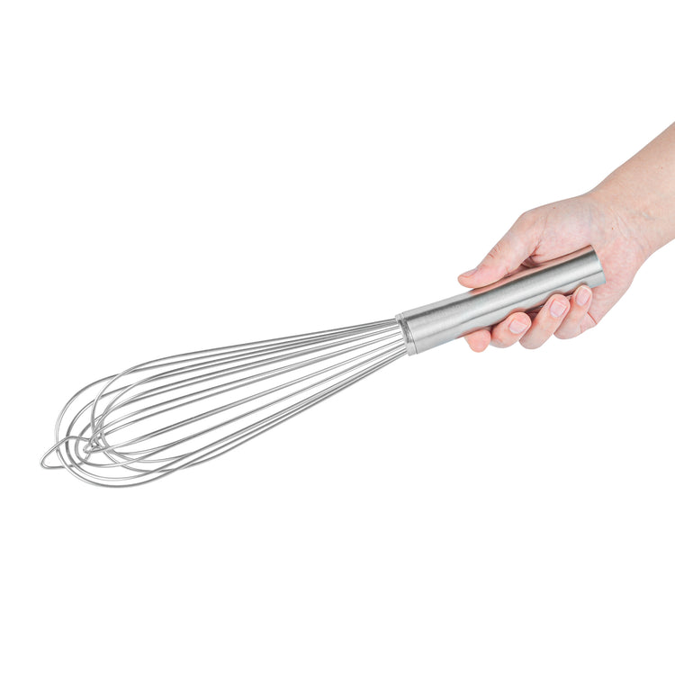 Construct silky smooth batters with our Met Lux Stainless Steel French Whisk. Manufactured with premium stainless steel, this baking whisk stands the test of time by resisting rust, ensuring enduring use. The thick wires of this hand whisk is ideal for rustling up thicker batters and guarantees well-mixed results. This stainless steel whisk includes an ergonomic handle for a comfortable grip, promoting an efficient cooking experience. Simplifying your post-cooking cleanup, this balloon whisk is dishwasher-safe. Measuring 16 inches in length by 3 inches in width by 3 inches in height, this cooking whisk is crafted to serve your whisking needs. Sold in a 1 count box.