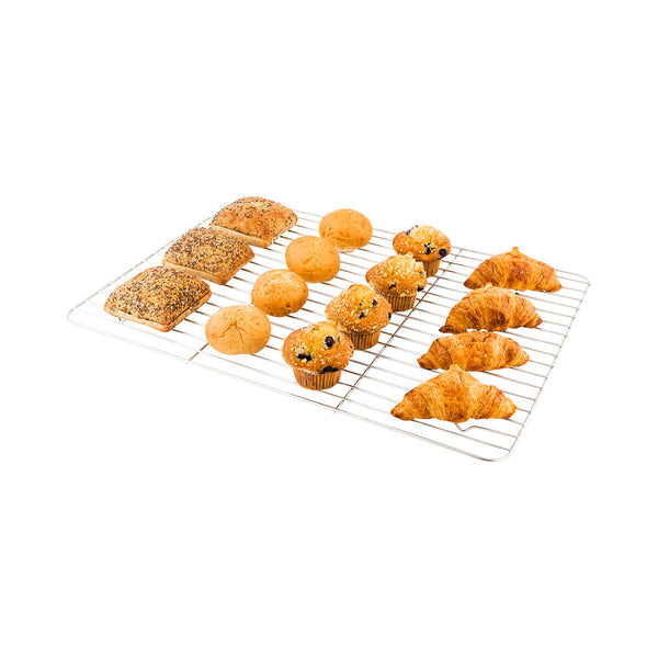 Carefully cool delicate pastries and delicious cakes using our Met Lux Stainless Steel Full Size Cooling Rack. Great for bakeries, restaurants, or catering events, this cooling rack is sized for baking large amounts of goods. The parallel design of the wires allows for a steady airflow to evenly cool down treats. To avoid spills or messes, the footed base of this wire baking rack provides elevation on pans to keep goods from sitting in oils or grease. After baking, simply place this cooling rack into the dishwasher for a quick and easy cleanup. This wire rack can be used for baking or broiling, perfect for sweets and savory foods. Crafted from durable stainless steel, this wire-rack is corrosion-resistant for long-lasting use. Measuring 24 inches in length by 18 inches in width, this wire baking rack is available in a 1 count box.