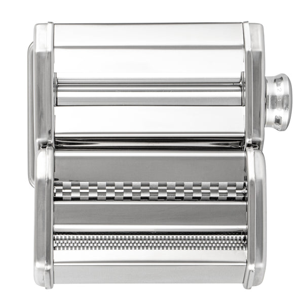 Effortlessly craft perfect pasta with precise control. The Met Lux Adjustable Thickness Pasta Maker offers nine thickness settings, allowing chefs to customize pasta for a variety of dishes. This noodle maker machine features two interchangeable blades, seamlessly switching between spaghetti and fettuccine to enhance menu versatility. Engineered with a stable table clamp and a nonslip base, it ensures a comfortable and secure operation on your countertop, measuring 8.3 inches in length, 7.8 inches in width, and 6.2 inches in height. Made from durable stainless steel, this pasta maker not only withstands the demands of a busy kitchen but also delivers a sleek, silver finish that complements any culinary environment. Elevate your pasta-making process and delight your customers with consistent, high-quality results using this stainless steel pasta machine. Each order includes 1 Met Lux Adjustable Thickness Pasta Maker.