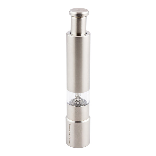 Sprinkle freshly ground pepper on your customer's dish with our Met Lux Stainless Steel Salt or Pepper Mill. Featuring a push top, this pepper dispenser allows you to easily grind and release finely ground pepper with only one hand. Made out of sturdy stainless steel, this salt grinder is corrosion-resistant, making it perfect for constant use at your restaurant, catered event, or other foodservice establishment. Designed with a transparent window, this pepper grinder clearly displays when it is running out of spices. With a silver finish, this pepper grinder adds a sophisticated touch to your dining tables. This salt pepper mill is hand wash only to preserve its high-quality look. This silver pepper grinder measures 1 inch long by 1 inch wide by 6 inches in height. Sold in a 1 count box.