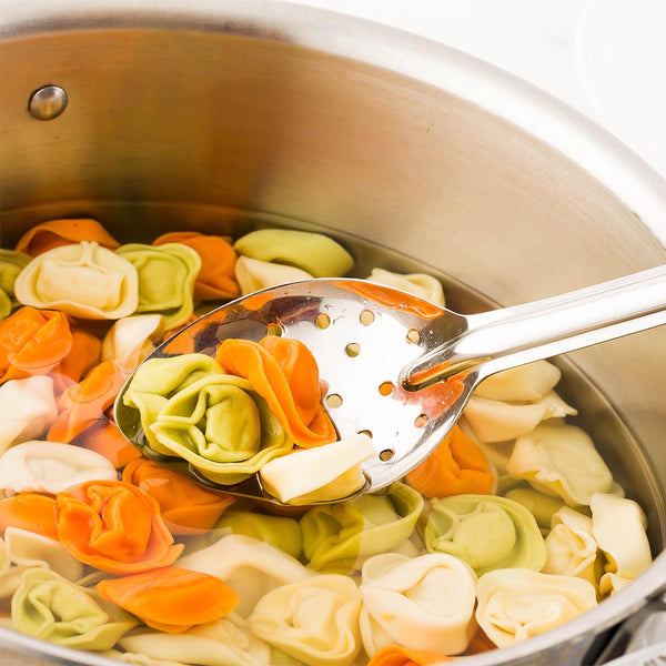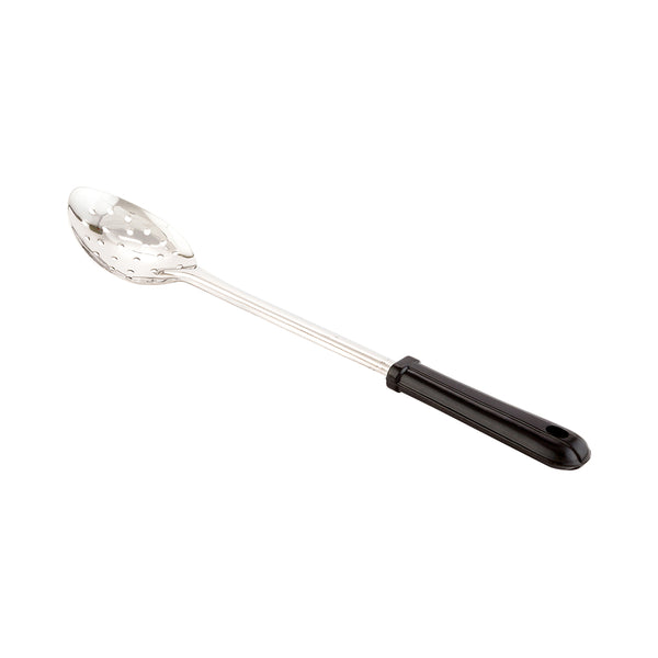 Comfortably stir, strain, and serve your delicious dishes with this Met Lux Perforated Serving Spoon with Black Plastic Handle. Equipped with an easy-to-grip plastic handle, this stainless steel serving spoon ensures a comfortable grip for secure and efficient use. The rounded, perforated design easily fishes solid foods out of sauces and stocks, while the extended handle keeps hands clean and dry. Crafted from high-quality stainless steel, this catering serving spoon is incredibly strong and rust-resistant. Whether you use it as a buffet serving spoon at your next catered event, or as an all-purpose basting spoon in your restaurant's kitchen, this perforated spoon is designed to withstand long-term commercial use. Each of these large serving spoons measures 15 inches long. Shipped in a 1 count box.