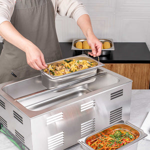 - Elevated platform secures your pans within the food well, preventing direct contact with surfaces