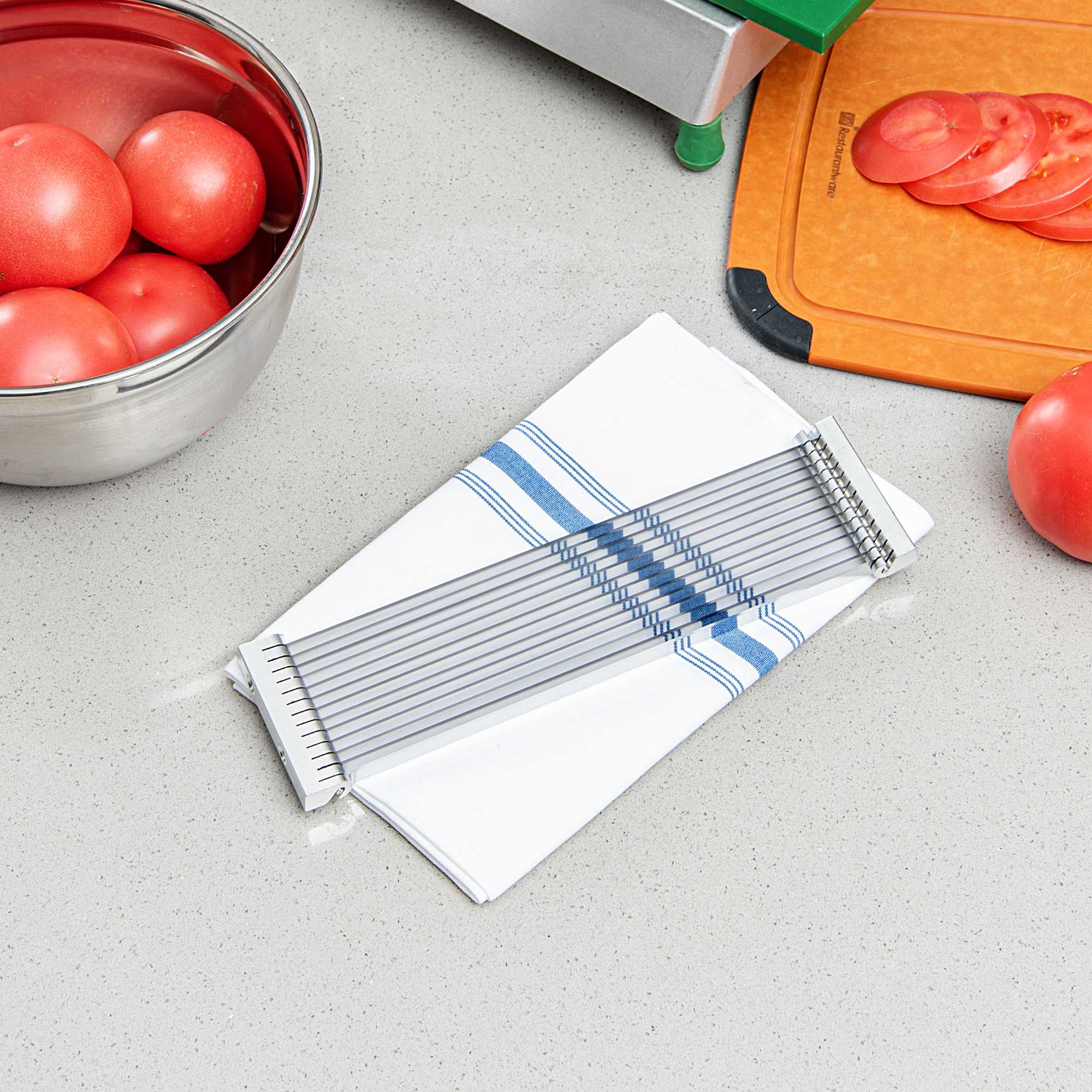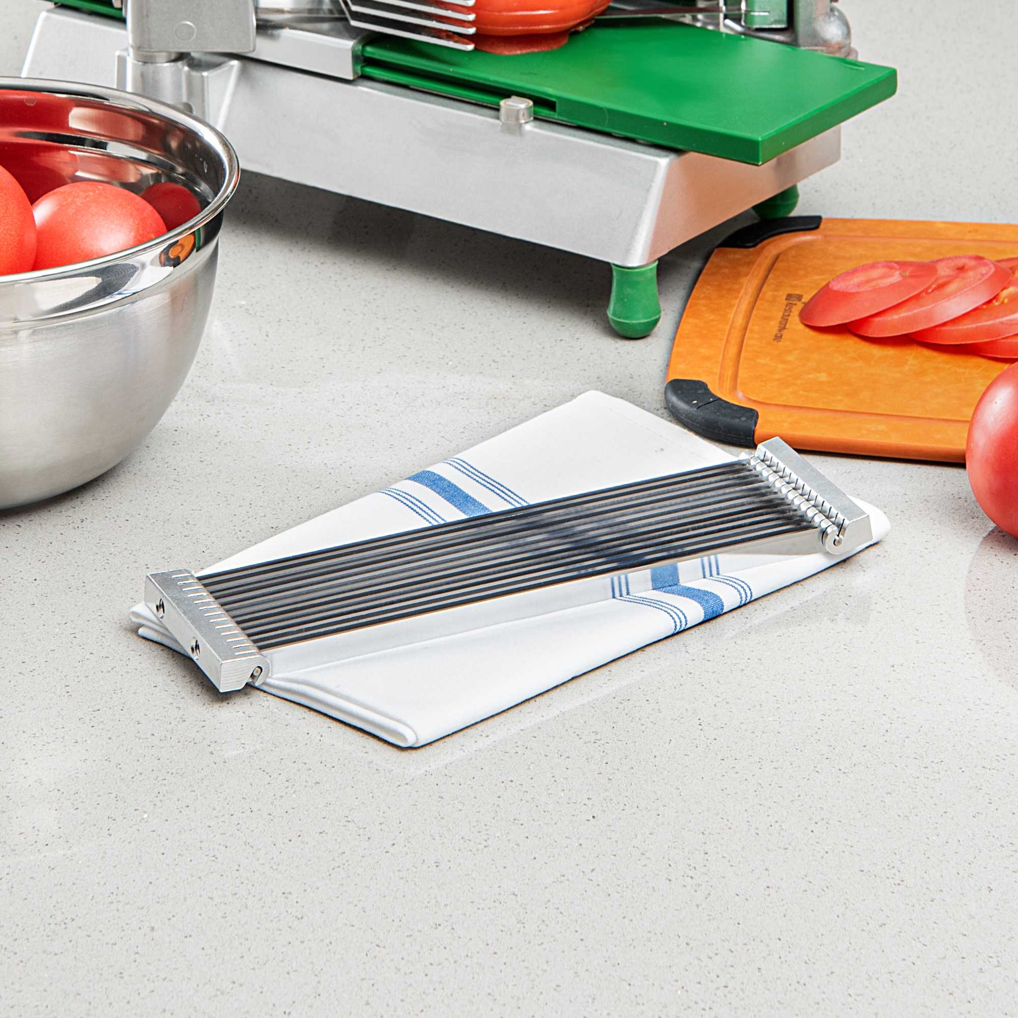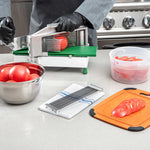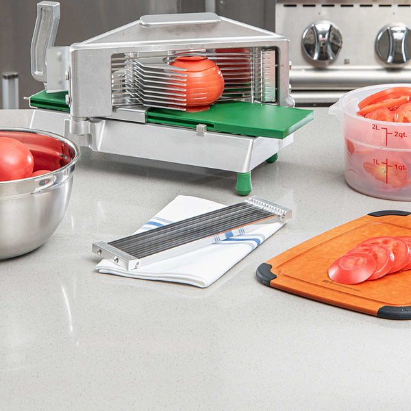 - Cuts tomatoes in 3/16" thick slices, ideal for uniform garnishes and salads