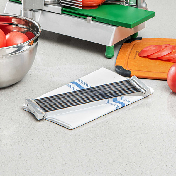 Minimize downtime with the Met Lux Stainless Steel Tomato Cutter Replacement. Engineered to cut tomatoes into precise 3/16-inch thick slices, this tomato cutter replacement is perfect for creating uniform garnishes and salads in high-demand environments. Equipped with a stainless steel slicer blade, it ensures consistent slices, reducing prep time in busy kitchens while maintaining sharpness and durability. The professional tomato cutter's design allows easy installation, serving as a replacement that keeps your operation running smoothly without interruptions. Measuring 10 inches in length by 2.9 inches in width, this essential kitchen tool is tailored for efficiency and precision, enhancing the output of commercial food preparation. Invest in kitchen reliability with our tomato cutter replacement to maintain your slicing efficiency and streamline your foodservice operation. Each order includes 24 Met Lux Stainless Steel Tomato Cutter Replacements.