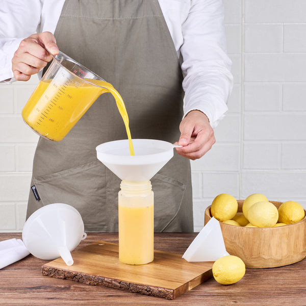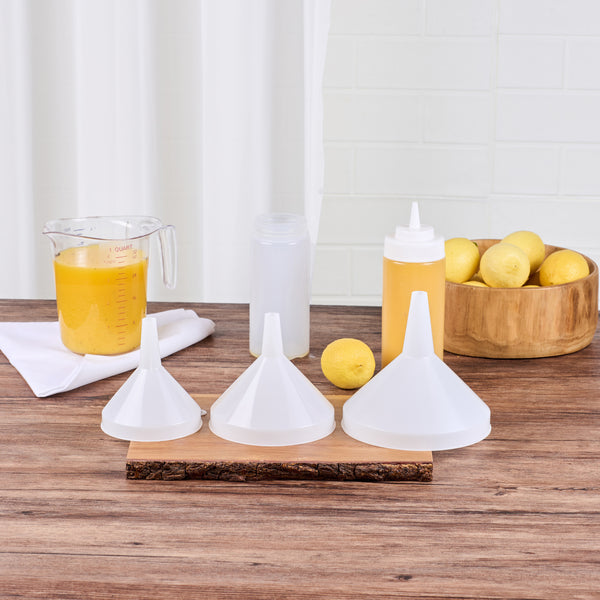 Introducing our Met Lux White Plastic Funnel Set, the ultimate solution for all your kitchen needs. These multi-size funnels come in a 3-piece funnel kit featuring capacities of 8oz, 12oz, and 16oz to handle a variety of tasks effortlessly. With wide spouts, this white funnel set ensures smooth and efficient pouring, making it perfect for transferring liquids or dry ingredients with ease. Constructed from durable polyethylene, this plastic kitchen funnel set is built to withstand frequent use without compromising on quality. Cleaning is a breeze, as these food-safe funnel set pieces are designed for hassle-free maintenance. The versatility of this multi-purpose funnel set makes it an indispensable tool in any foodservice establishment or home kitchen. Each funnel measures 6.25 inches in length by 6.25 inches in width by 6 inches in height, offering a compact yet effective design. Sold in a 1 count box.