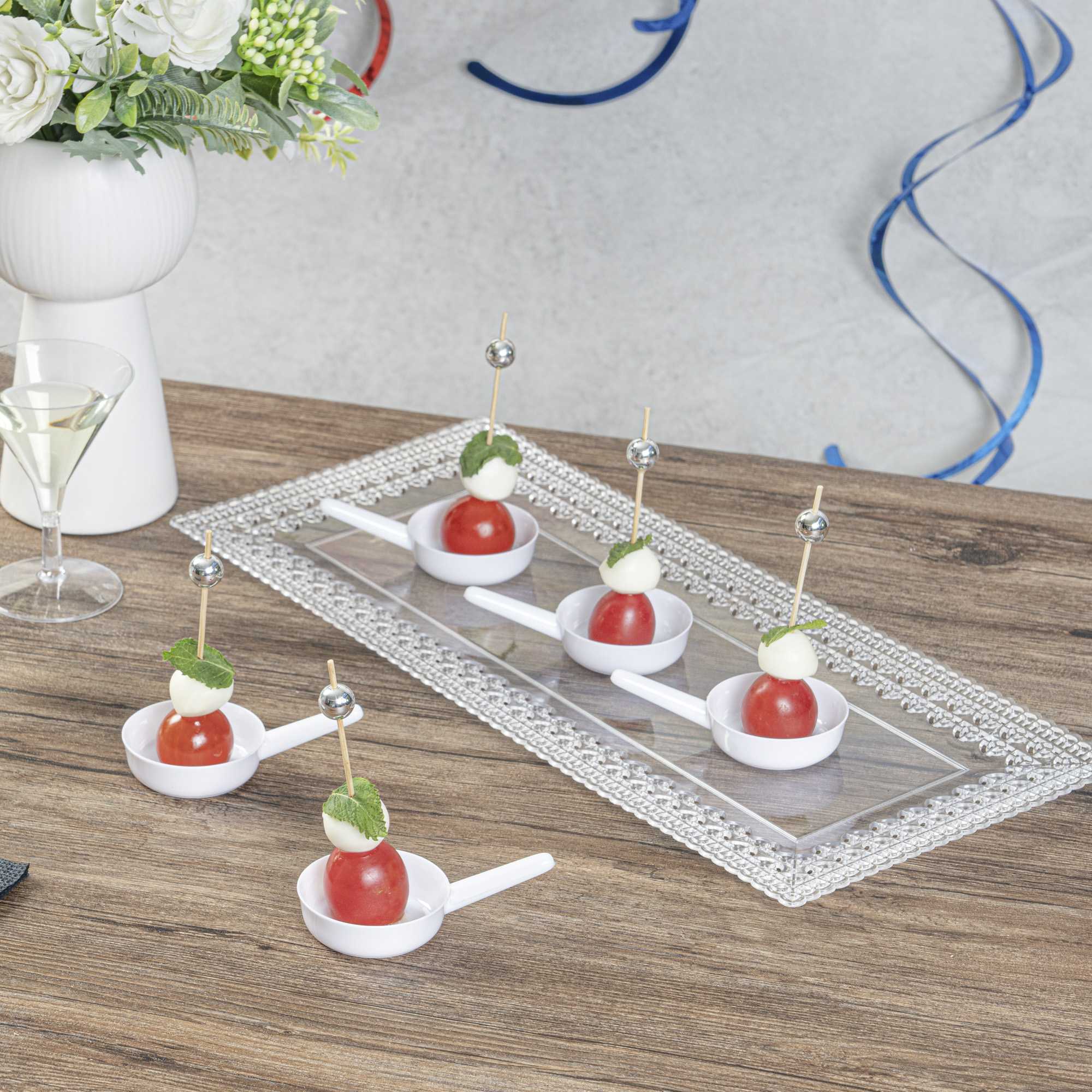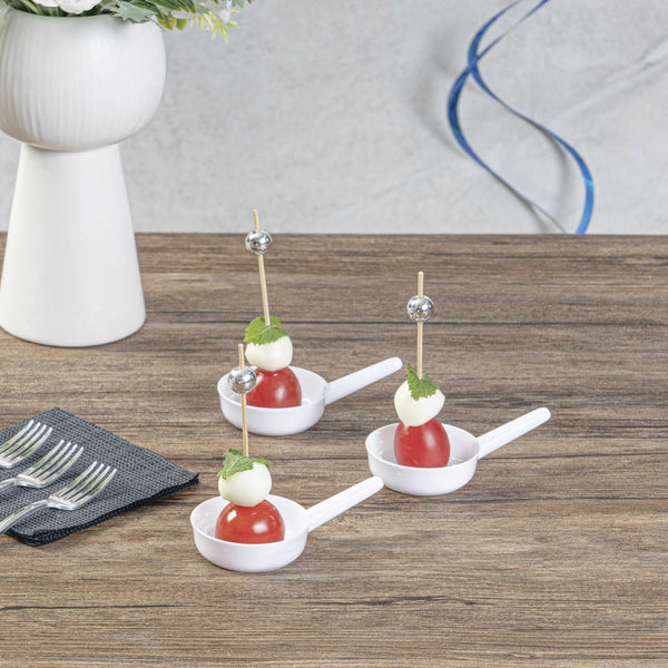 Introducing a distinctive, enchanting, and delightful way to present miniature treats with our Mini Serve 1-ounce Round White Plastic Mini Saucepans. These innovatively designed white mini plastic sauce pans make an excellent addition to tables. Equipped with a long handle, these appetizer dishes allow easy carrying around the table. The disposable nature of these mini appetizer cups simplifies the cleanup process. Crafted to be both disposable and sturdy, these dessert cups avoid cracking. The white finish of these chic mini sauce pans with handles gracefully showcases your desserts. Measuring 3.25 inches in length and 2 inches in width, these white dessert bowls with handles have a capacity of 1 ounce. Sold in a 100 count box.