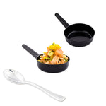 100 1 OZ ROUND BLACK MINI SAUCE PANS AND 100 SILVER 4" SPOONS