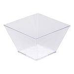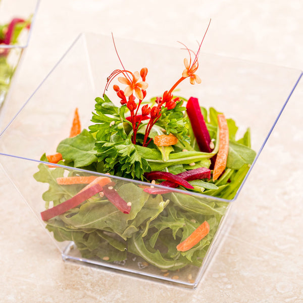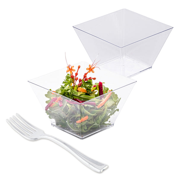 Turn your food presentation into an upscale event with our Mini Serve 16-ounce Square Clear Plastic Large Kova Bowls with Silver Plastic Mini Forks. Manufactured from high quality plastic, these square bowls and salad forks are conveniently disposable, perfect for an efficient cleanup. These 16-ounce bowls have a sleek square design and a clear finish to beautifully showcase vibrant salads, acai bowls or poke bowls while reducing environmental impact. With sturdy yet lightweight construction, these salad bowls provide an elegant and versatile solution for serving everything from appetizers to desserts. Paired with shiny silver plastic mini forks, these serving bowls create an elevated table setting that is perfect for any fast casual restaurant, cafe or catering event. These 4-inch forks have strong and sturdy handles are designed to stand up to hearty bites of any dish while their small size is ideal for accompanying personal sized portions. Measuring 4.25 inches long by 4.25 inches wide by 3 inches tall, these clear bowls have a capacity of 16 ounces, while the plastic forks measure 4 inches long. Each order includes 100 bowls and 100 forks.