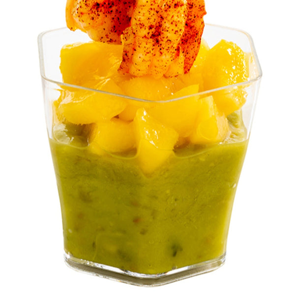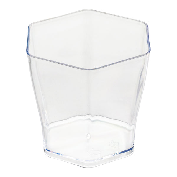 Bring a touch of geometric glamour to your catered events with our Mini Serve 2-ounce Hexagon Clear Plastic Glasses with Silver Plastic Mini Forks. Built from premium plastic, these party glasses are perfect for serving cold food items. The hexagonal shape of these disposable cups provides an artistic edge, while the clear finish allows colorful contents to shine through. These appetizer cups have a capacity of 2 ounces and are the perfect size for doling out samples of sorbet, mousse, or other dainty delights. Pair these hexagon cups with their included silver plastic forks for an elevated food presentation. These cake forks have sturdy handles, and sharp tines can easily pick up food while standing up to the heartiest scoops of your favorite food. For a seamless after-service cleaning experience, these clear plastic cups are disposable. These clear glasses measure 1.75 inches long by 1.75 inches wide by 1.75 inches tall and have a capacity of 2 ounces, while the plastic forks measure 4 inches long. Each order includes 100 glasses and 100 forks.