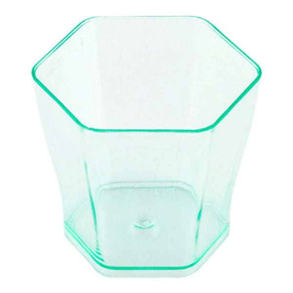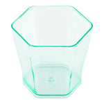 Impress your guests with an elevated presentation using our Mini Serve 2-ounce Hexagon Seagreen Plastic Glasses with Silver Plastic Mini Forks. Crafted from premium plastic, these appetizer cups are conveniently disposable to minimize cleanup after any event. These disposable cups have a translucent seagreen hue that will make a stylish statement at any cocktail party or tasting. With a capacity of 2 ounces, these hexagon-shaped glasses are ideal for serving bite-sized treats like miniature cheesecake, truffles, or fruit salads. Each plastic fork has a shiny silver finish, and when paired with these party glasses, they make an attractive duo for serving personal portions. These seagreen glasses measure 1.75 inches long by 1.75 inches wide by 1.75 inches tall and have a capacity of 2 ounces, while the cake forks measure 4 inches long. Each order includes 100 glasses and 100 forks.