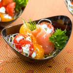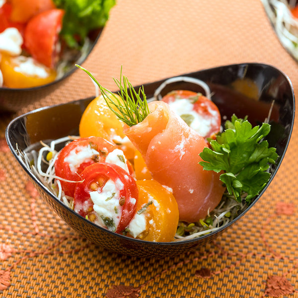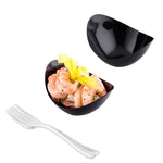 Serve delectable miniature appetizers and desserts in style with our Mini Serve 2-ounce Oval Black Plastic Alato Tasting Dishes with Silver Plastic Mini Forks. Made of premium plastic, these black bowls are durable and provide a chic way to present sweet and savory treats at catered events. These serving dishes have a minimalist, sleek oval shape with curved rims to beautifully highlight the look of your food presentation. With a capacity of 2 ounces, these oval bowls are perfect for serving single portions of various cold food items at your next catered event. These 4-inch forks have a shiny silver finish that effortlessly enhances your tantalizing dishes, while their sturdy handles allow guests to enjoy hearty bites, whether polenta or gelato. For a hassle-free cleaning experience, these candy dishes and appetizer forks are disposable, making them an excellent choice for events with large volumes. These plastic dishes measure 3.5 inches long by 2.75 inches wide by 1.75 inches tall and have a capacity of 2 ounces, while the plastic forks measure 4 inches long. Each order includes 100 dishes and 100 forks.