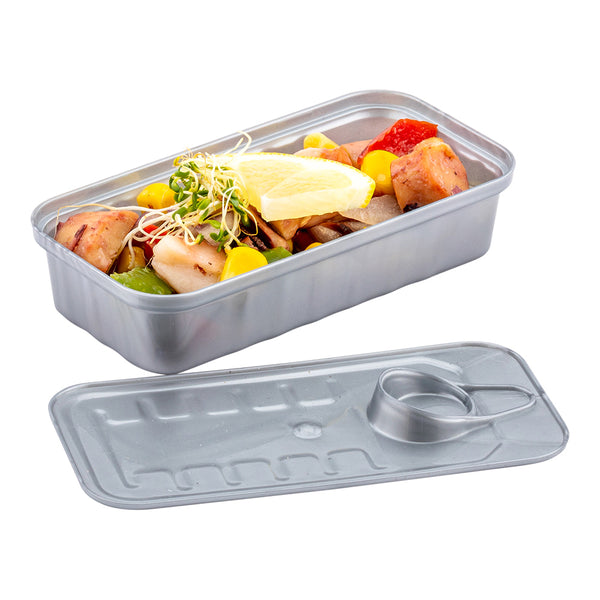 Elegantly serve appetizers while adding a touch of whimsy to your table setting using our Mini Serve 2-ounce Rectangle Silver Plastic Tin Cans with Silver Plastic Mini Forks. Crafted from high-quality plastic with a lustrous silver finish, these rectangular tin cans provide an authentic look reminiscent of traditional sardine tins but without the mess, thanks to their durable construction. These food containers have removable lids to keep food securely contained yet allow guests to playfully open their appetizers. Paired with these silver plastic forks, the food tin cans create an upscale presentation perfect for catered events, seafood restaurants, or anywhere aesthetics matter. Each appetizer fork has sturdy handles that can stand up to hearty bites, while its small size is ideal for sampling miniature tuna tartare or personal strawberry shortcakes. These take out containers and dessert forks are disposable to simplify your cleanup process after meals. Measuring 4 inches long by 2 inches wide by 1 inch tall, these rectangle tin cans have a capacity of 2 ounces, while the plastic forks measure 4 inches long. Each order includes 100 tin cans and 100 forks.