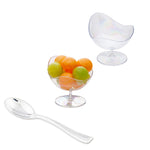 Elevate your culinary presentations with our Bundle: Mini Serve 100 2-ounce Round Clear Plastic Ball Chairs with 100 Silver Plastic 4-inch Mini Spoons, ensuring a visually stunning and convenient dining experience. This bundle includes round clear plastic ball chairs and silver plastic mini spoons, perfect for serving delectable bite-sized delicacies. Crafted from premium plastic, these dessert cups and spoons are durable and robust, ensuring they do not crack or warp. These plastic cups boast an expressive open-top shape and a tall base pedestal, transforming your appetizers into stunning showpieces that captivate your guests. With a clear finish, these appetizer cups elevate the visual appeal of your culinary masterpieces, lending them a sophisticated edge. These plastic spoons feature a shiny silver finish, effortlessly enhancing the presentation of your tantalizing dishes. With strong and sturdy handles, these 4-inch spoons stand up to hefty bites of polenta and big scoops of gelato. These disposable cups and spoons can be discarded after use, facilitating an easy cleanup. Measuring 2.75 inches in diameter by 2.75 inches in height, these clear plastic cups can hold up to 2 ounces. Each order includes 100 cups and 100 spoons
