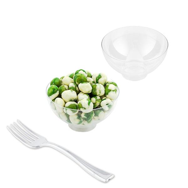 Create an elegant presentation with our Mini Serve 2-ounce Round Clear Plastic Coppa Bowls with Silver Plastic Mini Forks. Crafted from premium plastic, these appetizers bowls and dinner forks are conveniently disposable. These dome-shaped bowls feature a crystal clear finish that allows you to beautifully showcase colorful salads, fresh fruit, and decadent desserts to your guests. Holding up to 2 ounces, these clear bowls are ideal for use as mini plastic dessert cups or plastic appetizer cups at catered events like weddings, banquets, and buffets. These dessert bowls have a durable yet lightweight design provides optimal stability on any tabletop while the tapered sides offer a sleek look and comfortable grip. Each mini fork features a shiny silver finish and sturdy handles that can stand up to hearty bites, allowing you to enhance the presentation of your dishes. These round containers measure 2.5 inches diameter by 1 inch in height and have a capacity of 2 ounces, while the plastic forks measure 4 inches in length. Each order includes 100 bowls and 100 forks.