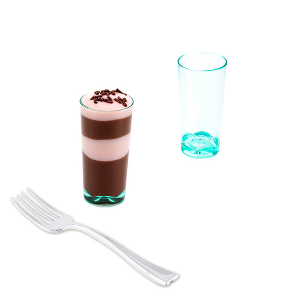 Throw an unforgettable party with our Mini Serve 2-ounce Round Seagreen Plastic Cannello Shot Glasses with Silver Plastic Mini Forks. Crafted from high-quality plastic, these shot glasses and tasting forks are durable and sturdy enough for any festive event while being ideal for serving desserts, specialty cocktails, or hors d'oeuvres. The lively tinted-seagreen hue of these dessert shooters brings an air of sophistication that is perfectly complemented by the shiny silver finish of these cake forks. With a capacity of 2 ounces, these shot cups are the perfect size for various miniature desserts, while the 4-inch forks have sturdy handles that can stand up to hearty scoops without bending or breaking. These round cups and appetizer forks are conveniently disposable, making them an ideal option for large events as they offer a hassle-free cleaning experience. The rounded rim of these dessert cups enables easy savoring, while the tapered handle of these disposable forks ensures a comfortable grasp. These dessert cups measure 1.5 inches in diameter by 3 inches in height and can hold up to 2 ounces, while the plastic forks measure 4 inches in length. Each order includes 100 glasses and 100 forks.