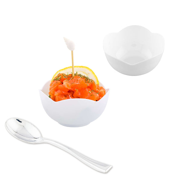 Elevate your appetizer presentations with our Bundle: Mini Serve 100 2-ounce Round White Plastic Le Fleur Cups with 100 Silver Plastic 4-inch Mini Spoons. This bundle includes premium floral-shaped bowls and sleek silver spoons, perfect for displaying and serving delectable bites. Crafted from durable plastic, these disposable cups and spoons do not crack and warp easily, ideal for busy foodservice establishments. With petal-like sides, these plastic cups boast an attractive silhouette that enhances any tablescape. The elegant white finish of these appetizer cups adds sophistication to your food displays. Complementing the cups, these plastic spoons feature a shiny silver finish, effortlessly enhancing the presentation of your tantalizing dishes. These 4-inch spoons have sturdy handles and are ideal for serving everything from miniature tuna tartare to hefty polenta bites. To facilitate an easy cleanup, these dessert cups and spoons are disposable and can be discarded after use. Measuring 2.25 inches in length by 1.5 inches in width by 1.25 inches in height, these white cups can hold up to 2 ounces. Each order includes 100 cups and 100 spoons.