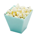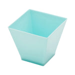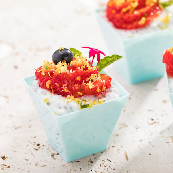 Serve up delectable mini desserts, yogurts, puddings, sundaes, candies, pastries, or appetizers in style with our 2-ounce Square Baby Blue Plastic Mini Kova Cups with Silver Plastic Mini Forks. Constructed from high-quality plastic, these dessert cups are sturdy enough for outdoor or indoor serving, adding a delightful aesthetic to any restaurant, catered event, or party tablescape and decor. Disposable, these food cups and cake forks are a perfect flatware option for foodservice establishments as they streamline your cleaning process. Holding up to 2 ounces, these baby blue cups are ideal for serving miniature treats. These pudding cups have a square design and baby blue finish to elevate your food presentation, while the shiny silver finish of the included dinner forks effortlessly enhances your tantalizing dishes. Each disposable fork features a strong and sturdy handle built to stand up to hefty bites of polenta and big scoops of gelato. Pair these appetizer cups with their coordinating lids (SKU: RWP0305C) to form a tight-fitting seal. These square cups measure 2 inches long by 2 inches wide by 1.75 inches tall and have a capacity of 2 ounces, while the plastic forks measure 4 inches long. Each order includes 100 cups and 100 forks. Lids are available and sold separately.