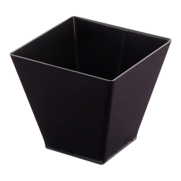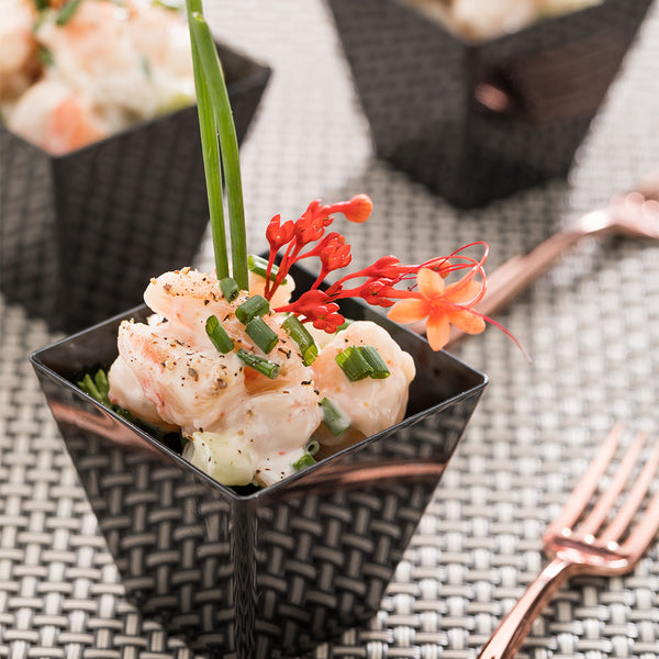 Serve individual portions with flair with our 2-ounce Square Black Plastic Mini Kova Cups with Silver Plastic Mini Forks. Crafted from high-quality plastic, these dessert cups and mini forks ensure maximum durability and can be used for outdoor or indoor events. With a glossy black finish and square silhouette, these food cups lend an upscale aesthetic to any tabletop, whether in a chic bistro or an elegant catered soiree. The included cake forks have a shiny silver finish for an elevated presentation that will delight guests. Disposable, these black cups and dinner forks offer a convenient cleaning process. These pudding cups have a capacity of 2 ounces, perfect for serving single portions of culinary delights. Each 4-inch fork features strong and sturdy handles, which can withstand hearty bites of cake and pastry without bending. Pair these appetizer cups with their coordinating lids (SKU: RWP0305C) to form a secure seal to lock flavors. These square cups measure 2 inches long by 2 inches wide by 1.75 inches tall and have a capacity of 2 ounces, while the plastic forks measure 4 inches long. Each order includes 100 cups and 100 forks. Lids are available and sold separately.