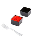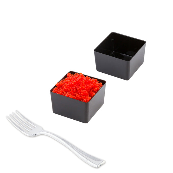 Serve up miniature treats in style with our Mini Serve 2-ounce Square Black Plastic Short Quadrato Cups with Silver Plastic Mini Forks. Manufactured from high-quality plastic, these black cups and tasting forks are disposable to provide an easy cleanup after large events. The sleek square shape and black finish of these parfait cups create an elegant yet casual look ideal for any special event while the tapered sides offer guests an easy grip to enjoy their miniature desserts. These tasting cups have capacity of 2 ounces and are ideal for serving single portions of appetizers and desserts. Featuring a shiny silver finish and sturdy handles, these plastic forks stand up to substantial bites. These square cups measure 1.75 inches long by 1.75 inches wide by 1 inch tall and have a capacity of 2 ounces, while the included mini forks measure 4 inches long. Each order includes 100 cups and 100 forks.