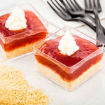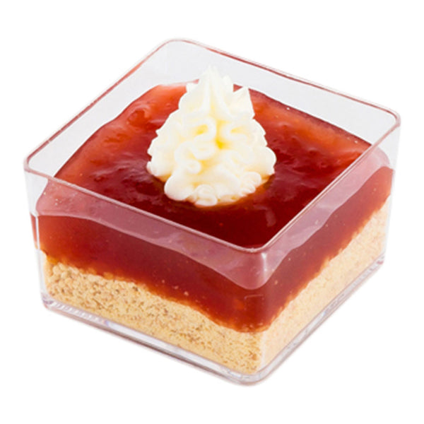 Elevate your dessert presentations with our Bundle: Mini Serve 100 2-ounce Square Clear Plastic Short Quadrato Cups with 100 Silver Plastic 4-inch Mini Spoons. This bundle includes clear plastic dessert cups with shiny silver plastic mini spoons. These dessert cups are made from durable plastic with thick walls to avoid cracking or breaking. The contemporary transparent design of these plastic cups offers a chic aesthetic perfect for sophisticated events. With a square base and straight sides, these appetizer cups have an elegant appearance, making them ideal for individual treats. Featuring a shiny silver finish, these 4-inch plastic spoons effortlessly enhance the presentation of your tantalizing dishes. The sturdy handles of these plastic spoons are perfect for hefty bites of polenta or big scoops of gelato. These disposable cups and spoons can be discarded after use and facilitate a straightforward cleaning experience. Measuring 1.75 inches in length by 1.75 inches in width by 1 inch in height, these clear plastic cups can hold up to 2 ounces. Each order includes 100 cups and 100 spoons.