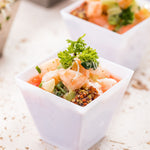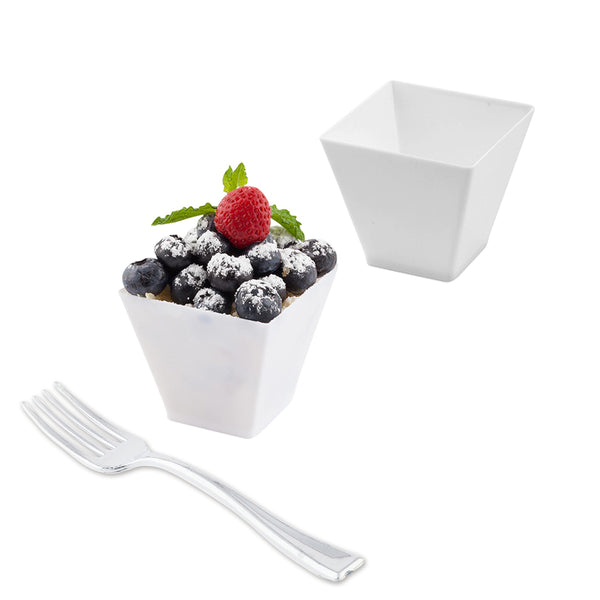 Add a touch of sophistication to any mini dessert or appetizer presentation with our Mini Serve 2-ounce Square White Plastic Mini Kova Cups with Silver Plastic Mini Forks. These dessert cups and cake forks are made from high-quality plastic and are disposable, ideal for a simple after-service cleanup. With a sleek square shape and classic white finish, these food cups elevate the look of your food presentation, while the shiny silver tasting forks complement all types of table decor. Holding up to 2 ounces, these white cups are ideal for serving up miniature portions of yogurt, pudding, candies, or mousse elegantly. These disposable forks have sturdy handles to effortlessly scoop up hearty bites of your favorite food without bending or breaking. Pair these appetizer cups with their coordinating lids (SKU: RWP0305C) to take food on the go. These plastic cups measure 2 inches long by 2 inches wide by 1.75 inches tall and have a capacity of 2 ounces, while the plastic forks measure 4 inches long. Each order includes 100 cups and 100 forks. Lids are available and sold separately.