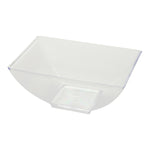 Elegantly serve delectable bites at your next catered event with our Mini Serve 3-ounce Rectangle Clear Plastic Small Architetto Bowls with Silver Plastic Mini Forks. Made from high-quality plastic, these candy bowls and cake forks are disposable, guaranteeing an easy post-event cleanup. These dessert bowls feature a crystal clear finish and modern rectangle design, stylishly displaying miniature appetizers, desserts, and snacks, while the shiny silver 4-inch forks effortlessly enhance your tantalizing dishes. Holding up to 3 ounces, these rectangle bowls are perfect for showcasing single portions of mixed berry yogurt parfaits or chocolate-coated almonds. Each dessert fork has sturdy handles built to withstand hearty portions of polenta and gelato. These clear bowls measure 3.25 inches long by 2.25 inches wide by 1.25 inches tall and have a capacity of 3 ounces, while the included plastic forks measure 4 inches long. Each order includes 100 bowls and 100 forks.