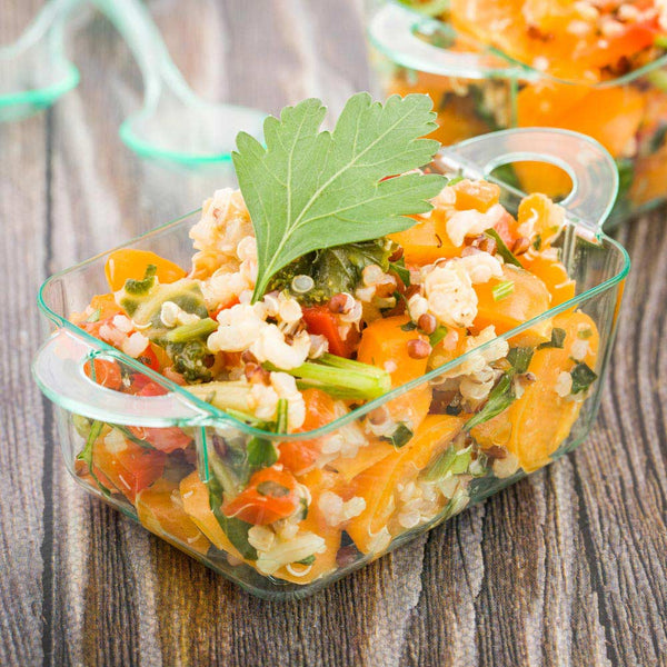 Exquisitely display gourmet servings using our Mini Serve 3-ounce Rectangle Seagreen Plastic Cocottes with Silver Plastic Mini Forks. These seagreen rectangle boxes are manufactured from superior plastic, ensuring heavy-duty durability, and are ideal for various cold food items. The rectangular shape of these food boxes instantly enhances the aesthetic appeal of your serving, making your offerings appear even more appetizing. These rectangle containers feature built-in handles, providing secure handling and significantly reducing spill risks. With a capacity of 3 ounces, these plastic dishes are perfect for serving small-sized portions of starters and desserts. Pairing these disposable food containers with silver plastic forks creates an attractive ensemble, elevating your plating presentations. For your convenience, these serving dishes and cake forks are disposable, simplifying the cleanup process post gatherings. The firm handles of these 4-inch forks ensure they can manage substantial bites, ensuring uninterrupted enjoyment of your dishes. These plastic food containers measure 3.75 inches long by 2 inches wide by 1.5 inches tall and have a capacity of 3 ounces, while the plastic forks measure 4 inches long. Each order includes 100 cocottes and 100 forks.
