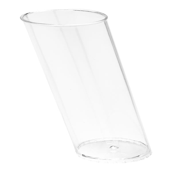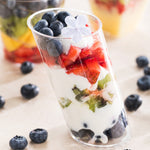 Elevate your appetizer and dessert presentations with our Bundle: Mini Serve 100 3-ounce Round Clear Plastic Mini Slope Cups with 100 Silver Plastic 4-inch Mini Spoons, offering a stylish solution for your catering needs. This bundle includes cups and spoons for a comprehensive dining experience. The unique slope design of these plastic cups instantly upgrades your appetizer and dessert displays, making them perfect for serving mixed berry yogurt parfaits at brunch buffets or individual portions of butterscotch mousse at catered events. Crafted from premium plastic, these appetizer cups and spoons are durable and do not crack easily. Featuring a crystal clear finish, these plastic cups showcases the colors and textures of your culinary masterpiece. These plastic spoons are designed with a shiny silver finish that effortlessly enhance the presentation of your tantalizing dishes. The sturdy handle of these 4-inch plastic spoons can handle hefty bites of polenta and big scoops of gelato. For quick cleanup, these disposable cups and spoons can be discarded after use. The dessert cups measure 2 inches in diameter by 3.75 inches in height and can hold up to 3 ounces. Each order includes 100 cups and 100 spoons.