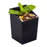 Impress your guests with an elegant presentation using our Mini Serve 3-ounce Square Black Plastic Incline Cups with Silver Plastic Mini Forks. Made from premium plastic, these square cups and tasting forks are conveniently disposable, ideal for easy after-service cleanup. These appetizer cups feature a square shape with a sloping edge that gives a chic look to your served appetizers. With a smooth black finish, these dessert cups add something exquisite and sophisticated to your table, elevating the overall aesthetic of your culinary presentation, while the shiny silver finish of these cake forks lends an elegant touch to your tablescape. These plastic cups can hold up to 3 ounces and are perfect for serving single portions of snacks. Measuring 1.75 inches long by 1.75 inches wide by 2.75 inches tall, these black cups have a capacity of 3 ounces, while the plastic forks measure 4 inches long. Each order includes 100 cups and 100 forks.