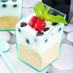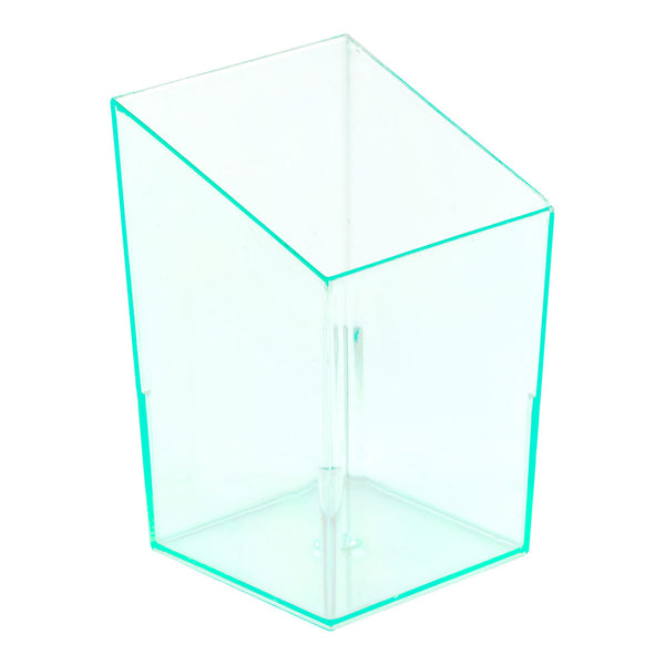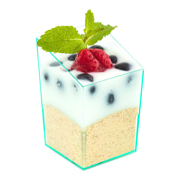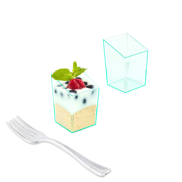 Provide an innovative way to serve miniature portions with our Mini Serve 3-ounce Square Seagreen Plastic Incline Cups with Silver Plastic Mini Forks. Crafted from premium plastic, these square cups and tasting forks are disposable for swift post-meal cleanup at restaurants or catered events. These appetizer cups are designed in a square shape with a sloping edge that gives every serving an inventive and sleek vibe, allowing customers to maximize every bite. With a tinted-seagreen finish, these pudding cups create an alluring charm for the dishes they contain, while the shiny silver finish of these cake forks effortlessly enhances the presentation of your tantalizing dishes. The strong, sturdy handles of these disposable forks stand up to hefty bites of polenta or big scoops of gelato. These dessert cups measure 1.75 inches long by 1.75 inches wide by 2.75 inches tall and have a capacity of 3 ounces, while the plastic forks measure 4 inches long. Each order includes 100 cups and 100 forks.